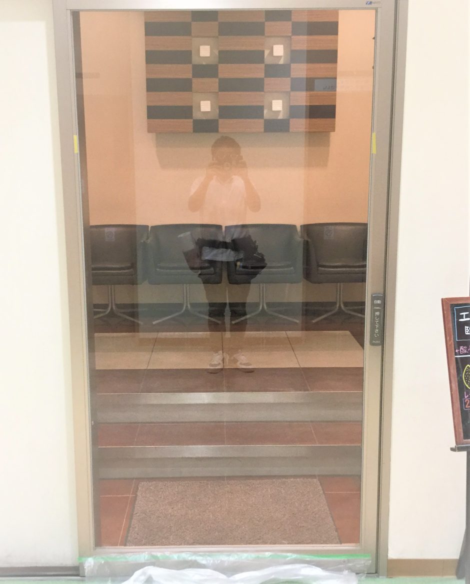 ‍自動ドア部にも同じようにスリガラス調フィルムとカッティングシート。
