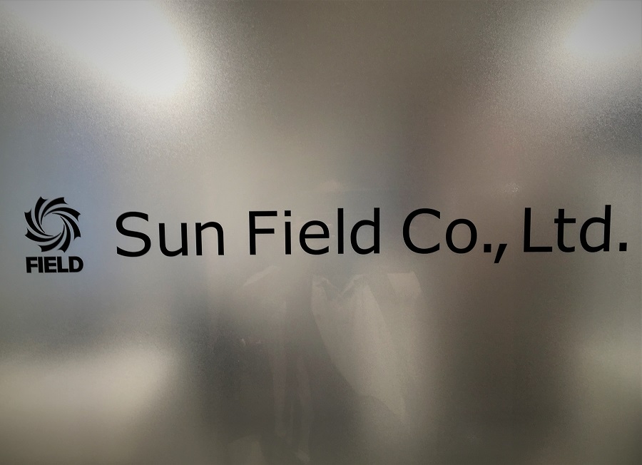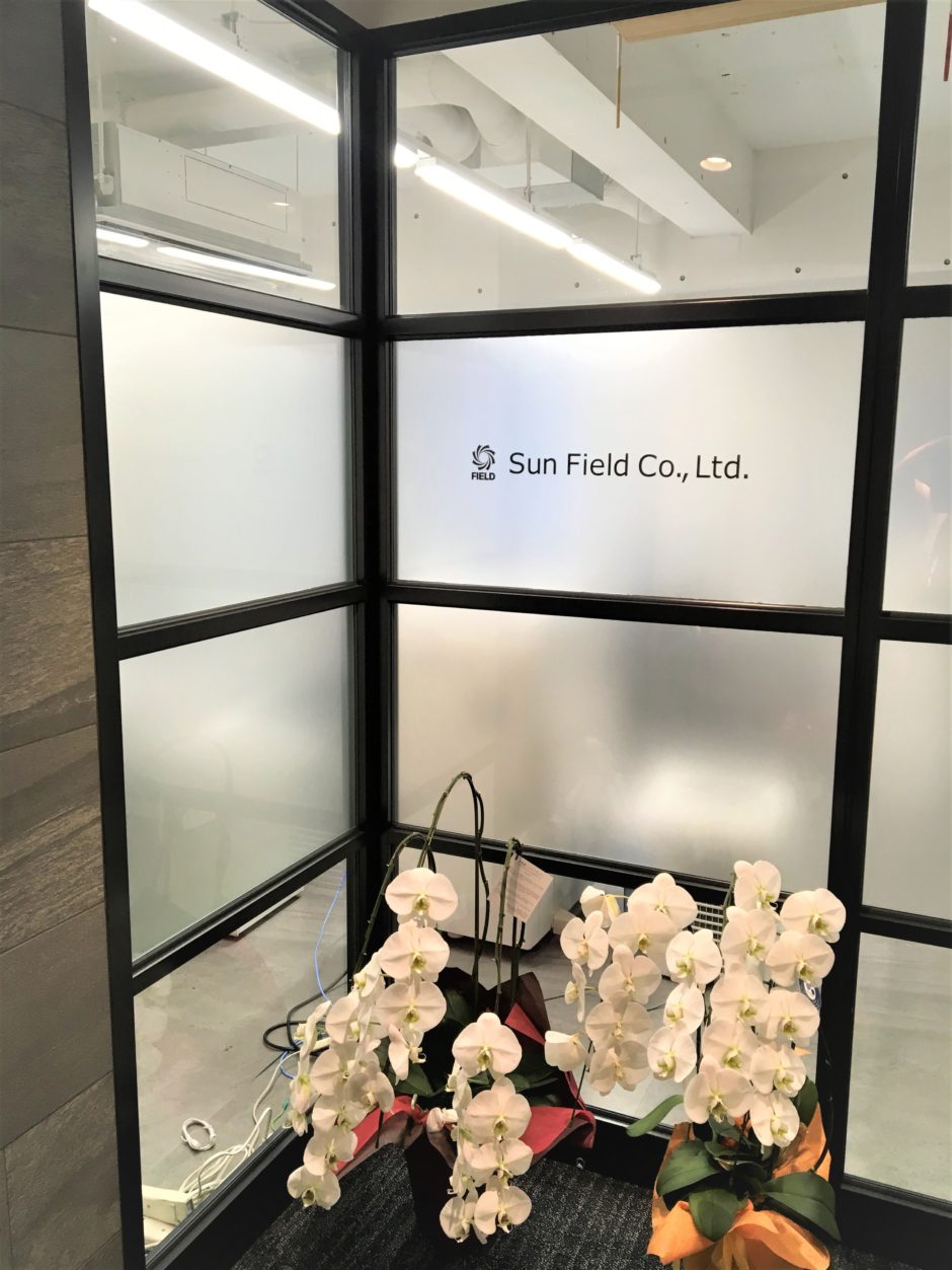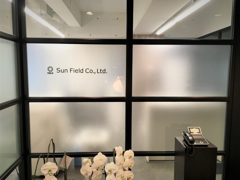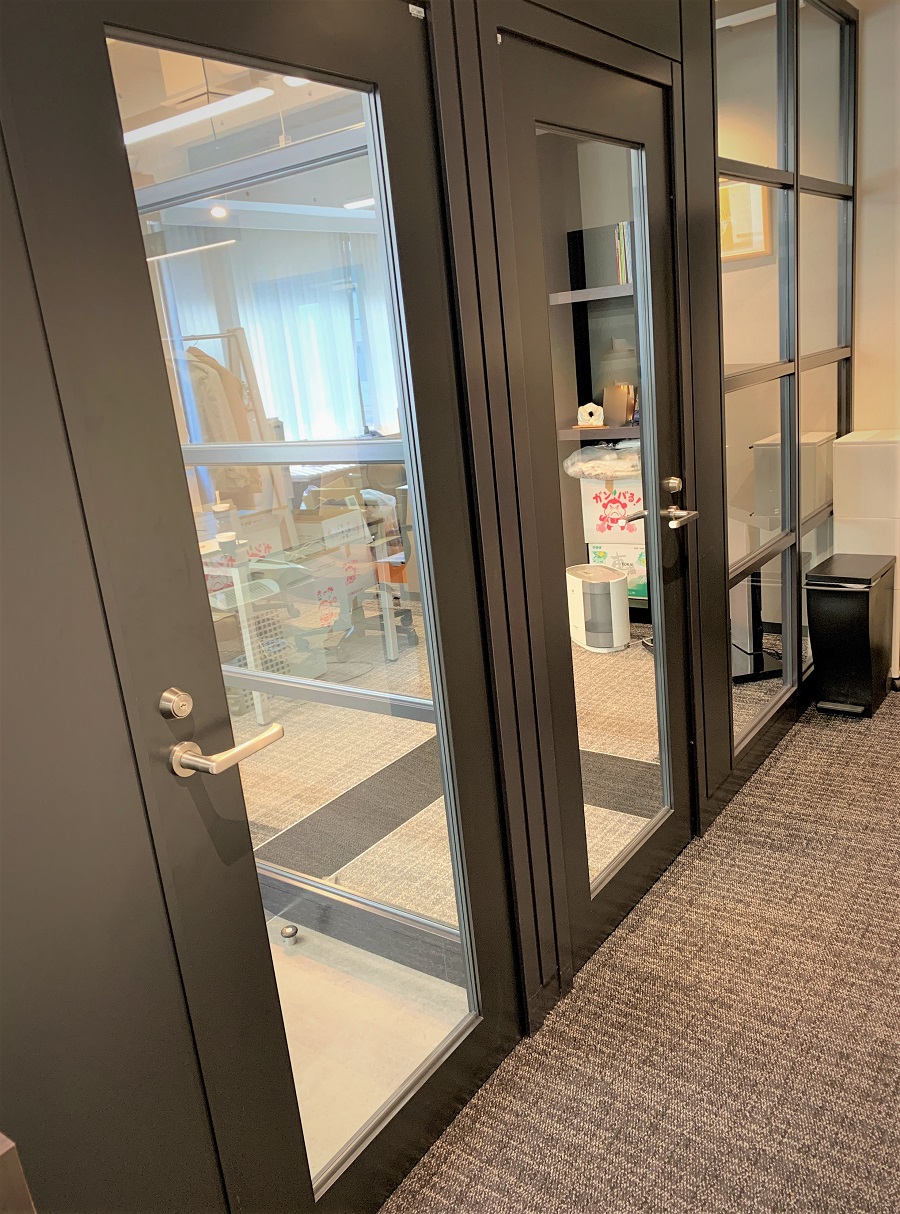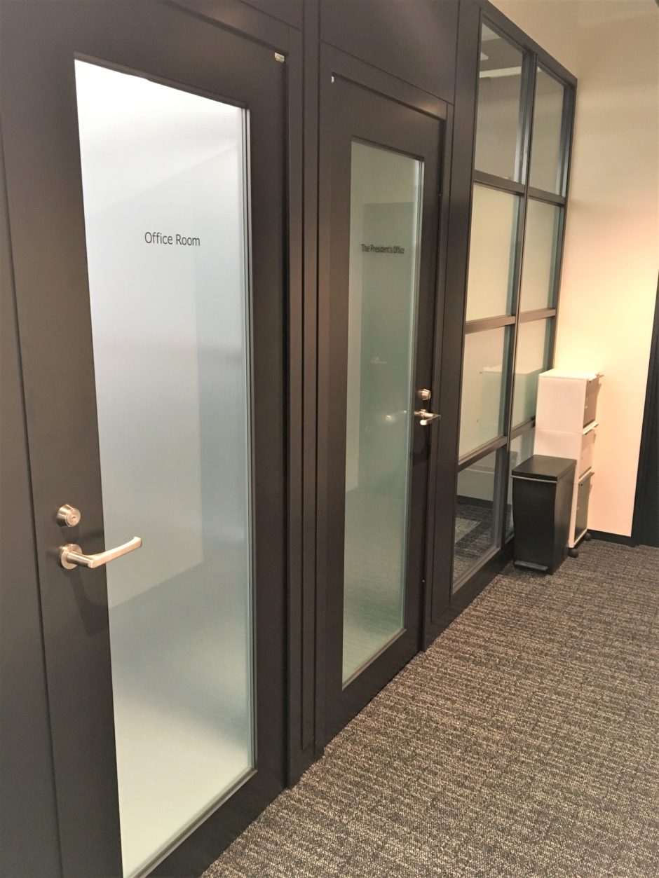 ‍オフィス窓扉に目隠しフィルムおよびカッティングシートを貼り付け。