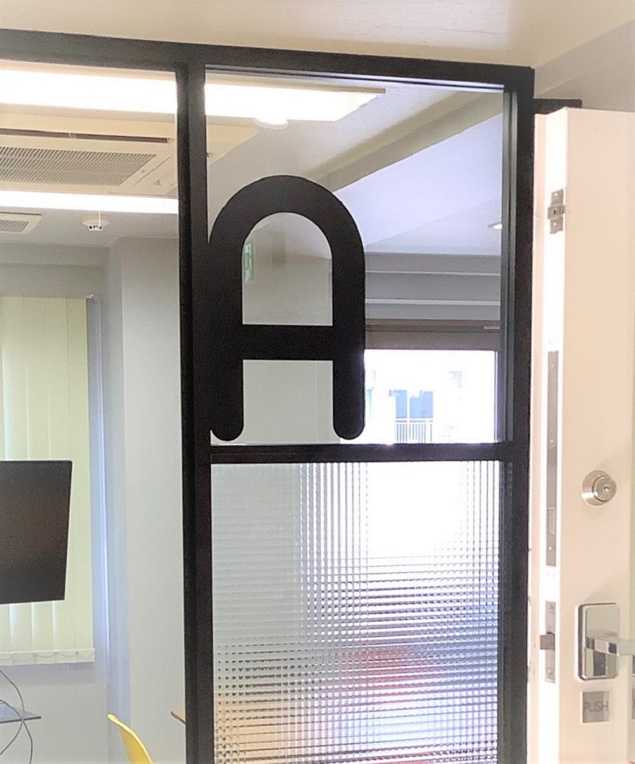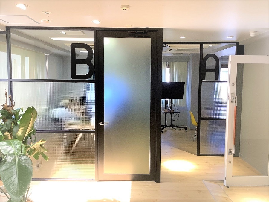 ‍会議室のガラス壁面にルームネームをカッティングシートで。