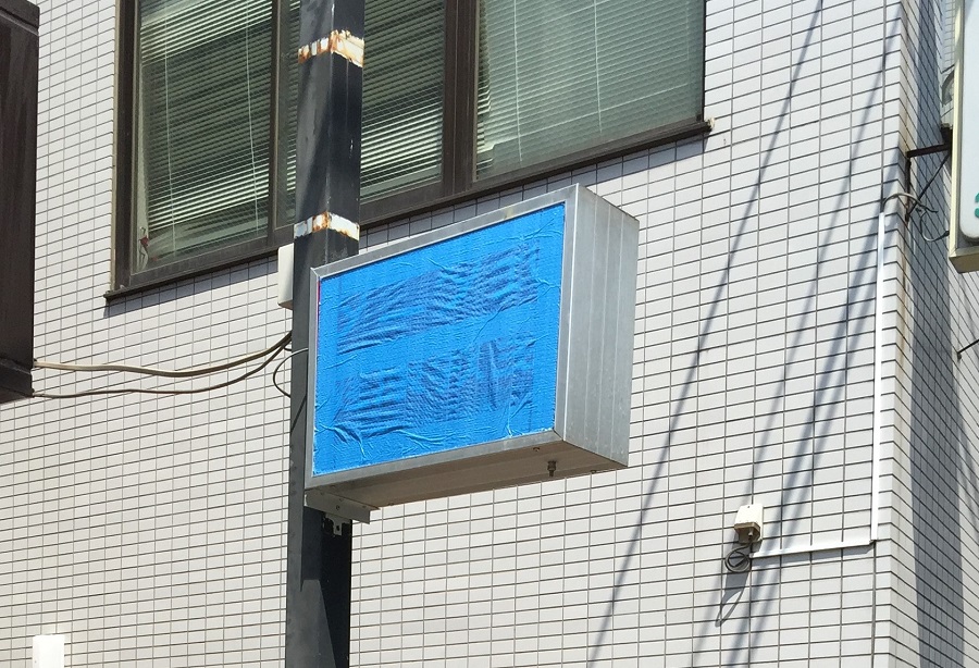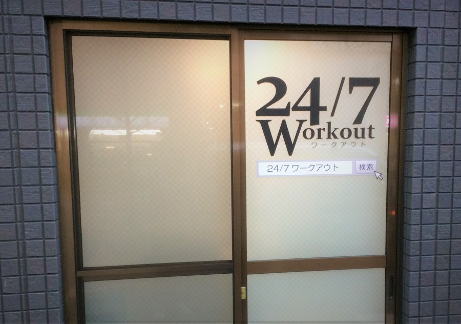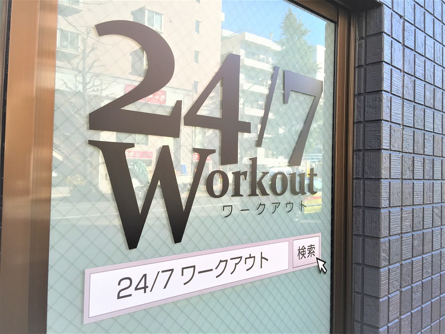 ‍店舗入り口引き違い窓に目隠しフィルムと店舗のロゴカッティングシート。