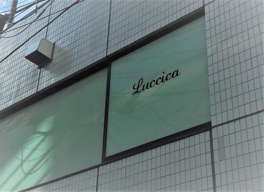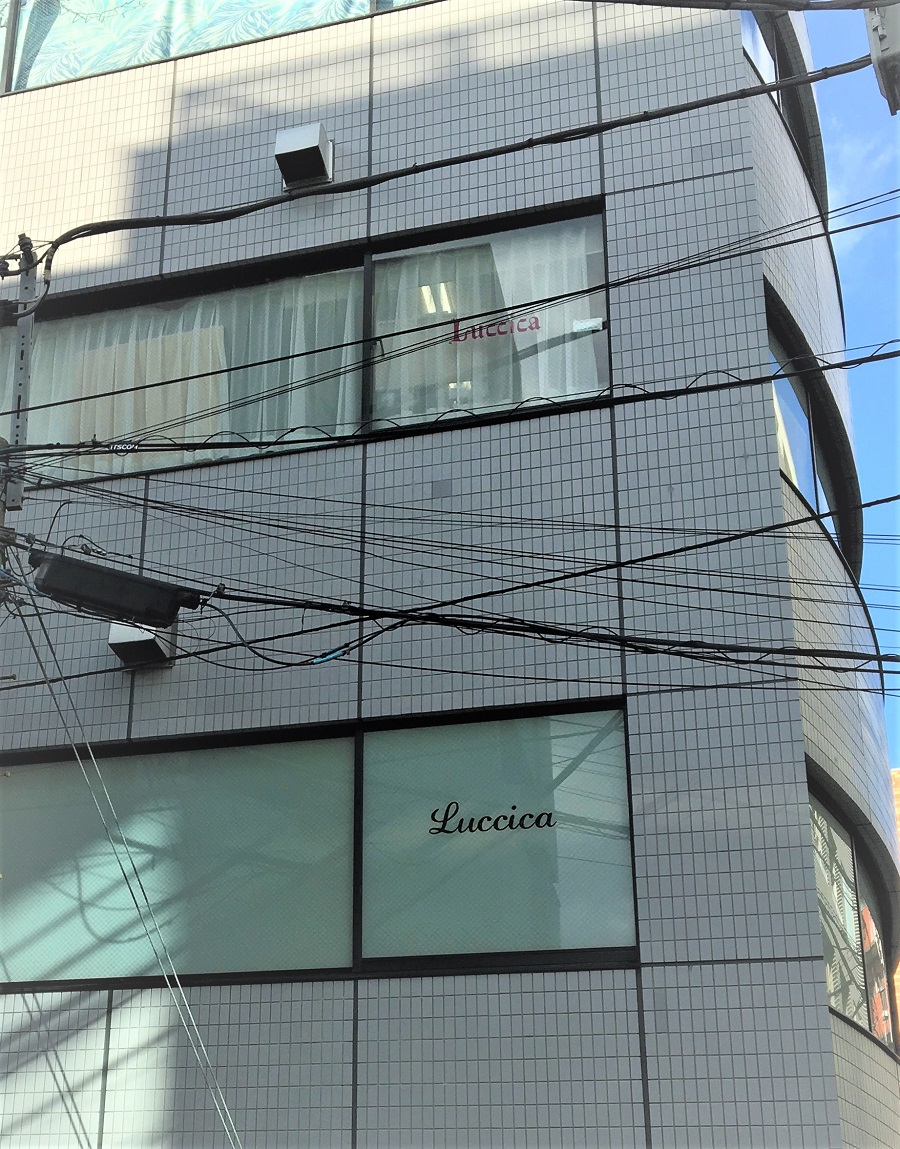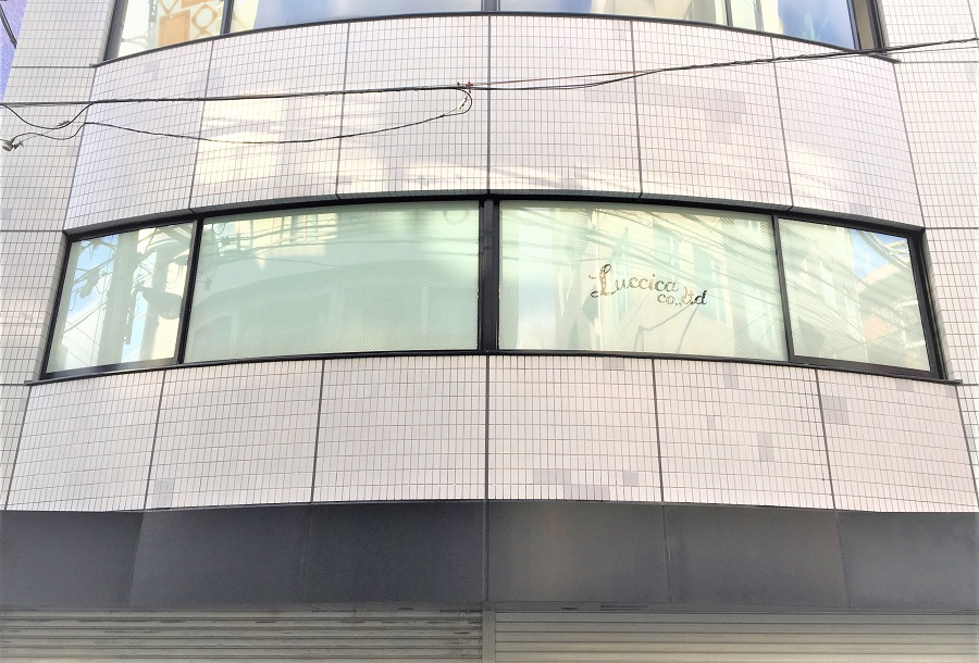 ‍ビル2Fオフィスの窓部に目隠しフィルムと社名のロゴのカッティングシートを貼り付け。