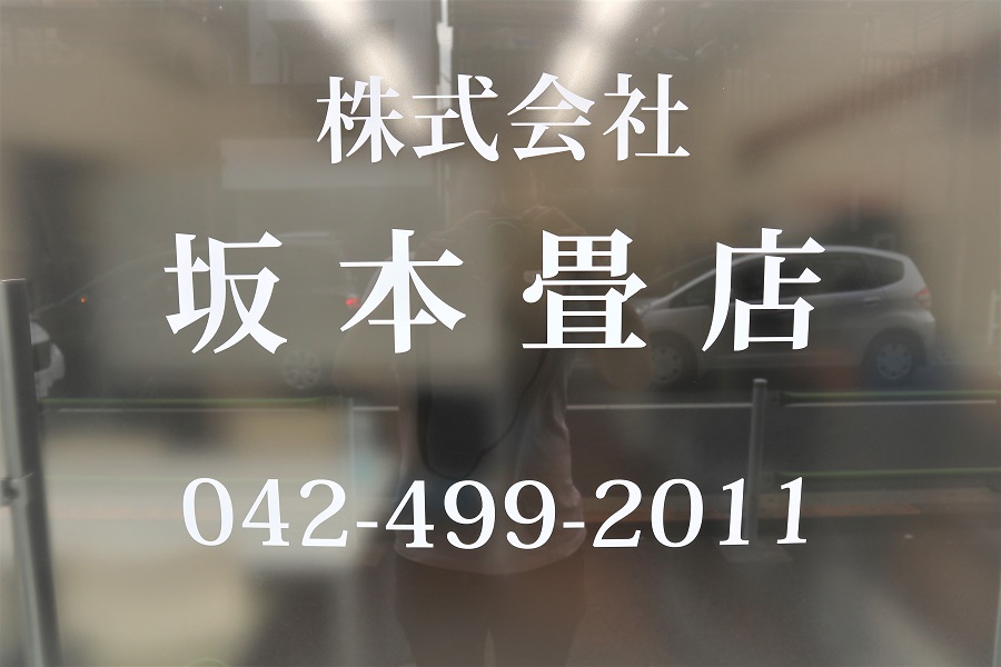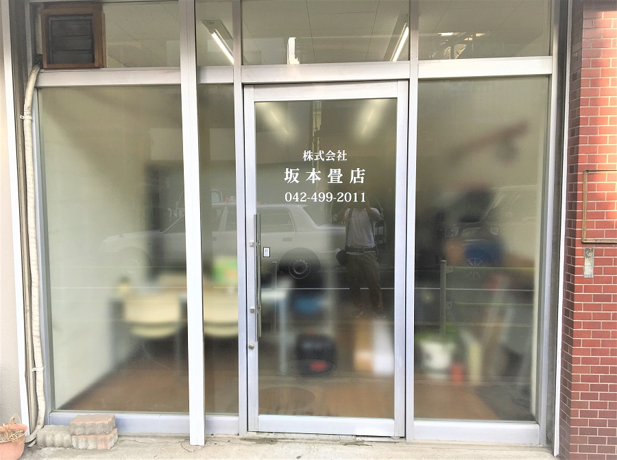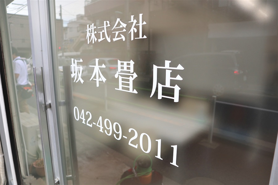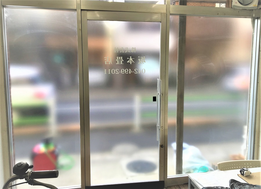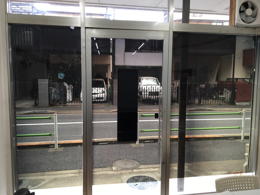 ‍店舗入り口、路面側の前面ガラスに目隠しフィルムを貼付。