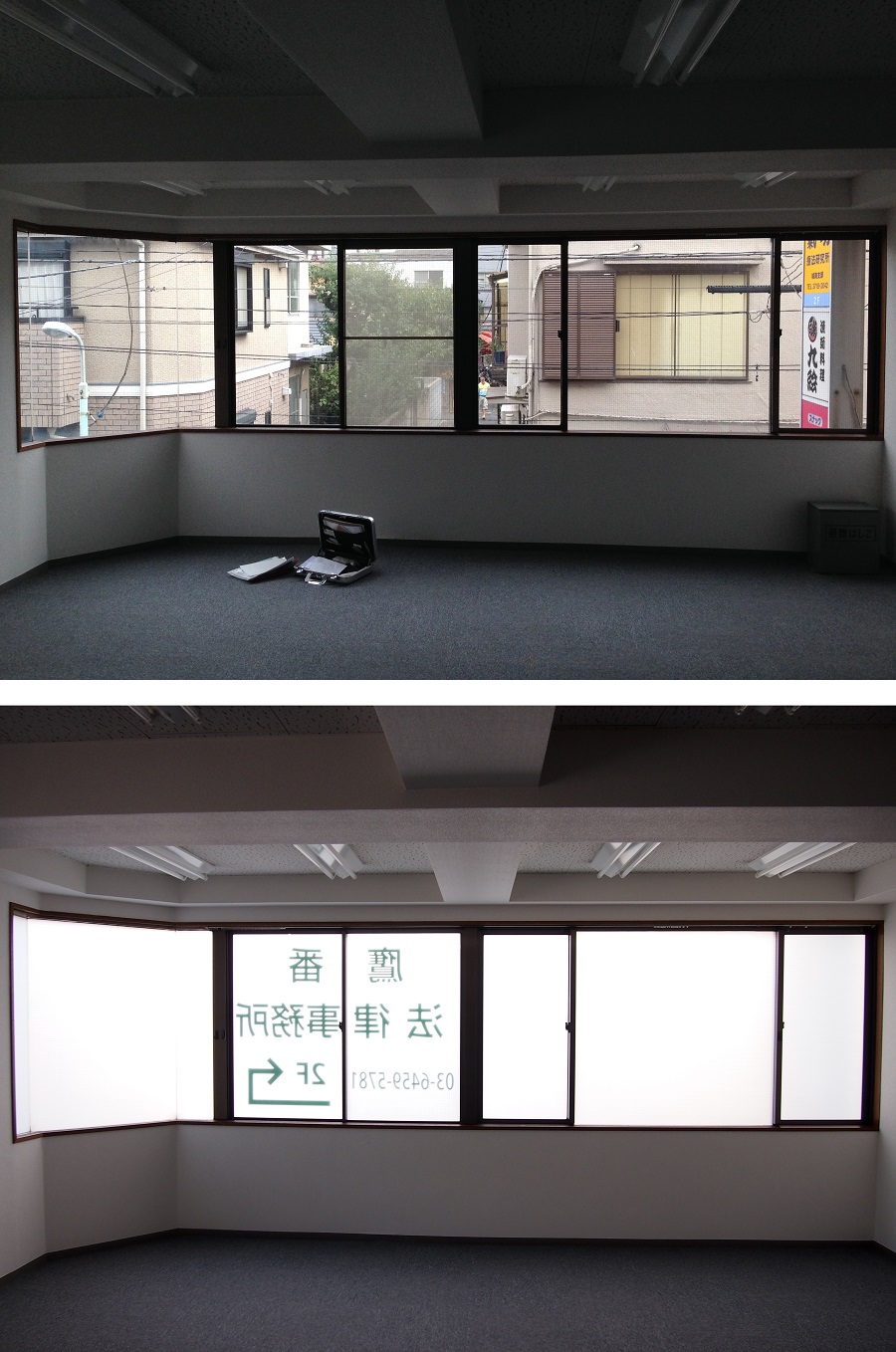 ‍施工前と施工後。ビル2Fの事務所窓に目隠しフィルムとカッティングシートを貼付。