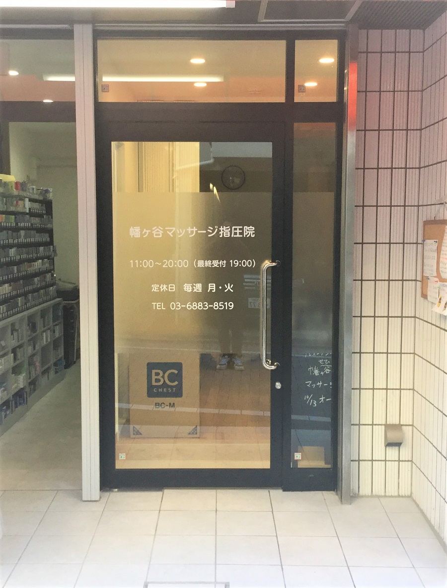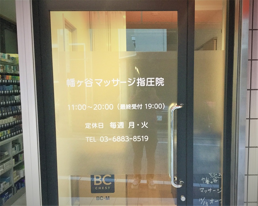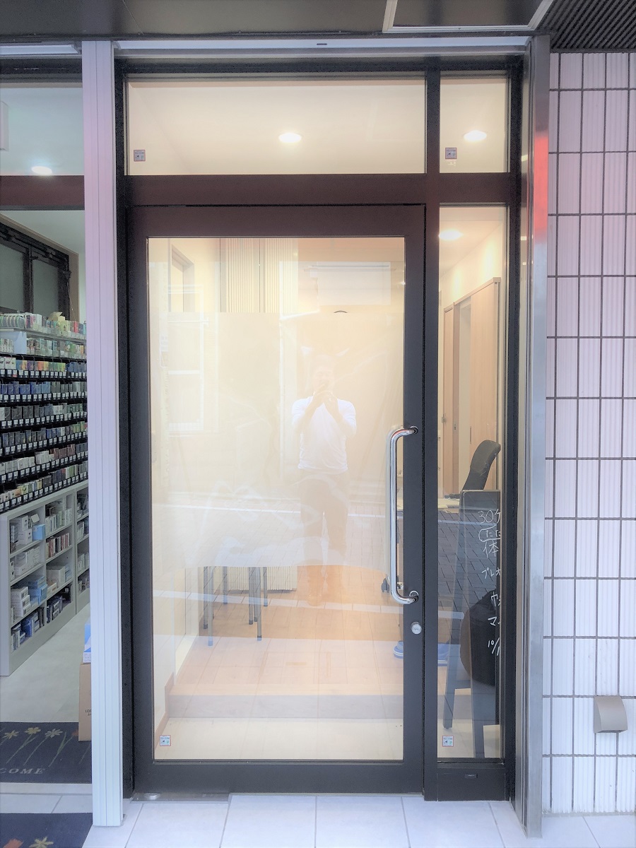 ‍施設情報をカッティングシートで、ドアガラス部分とサイドのフィクス窓に目隠しフィルム。
