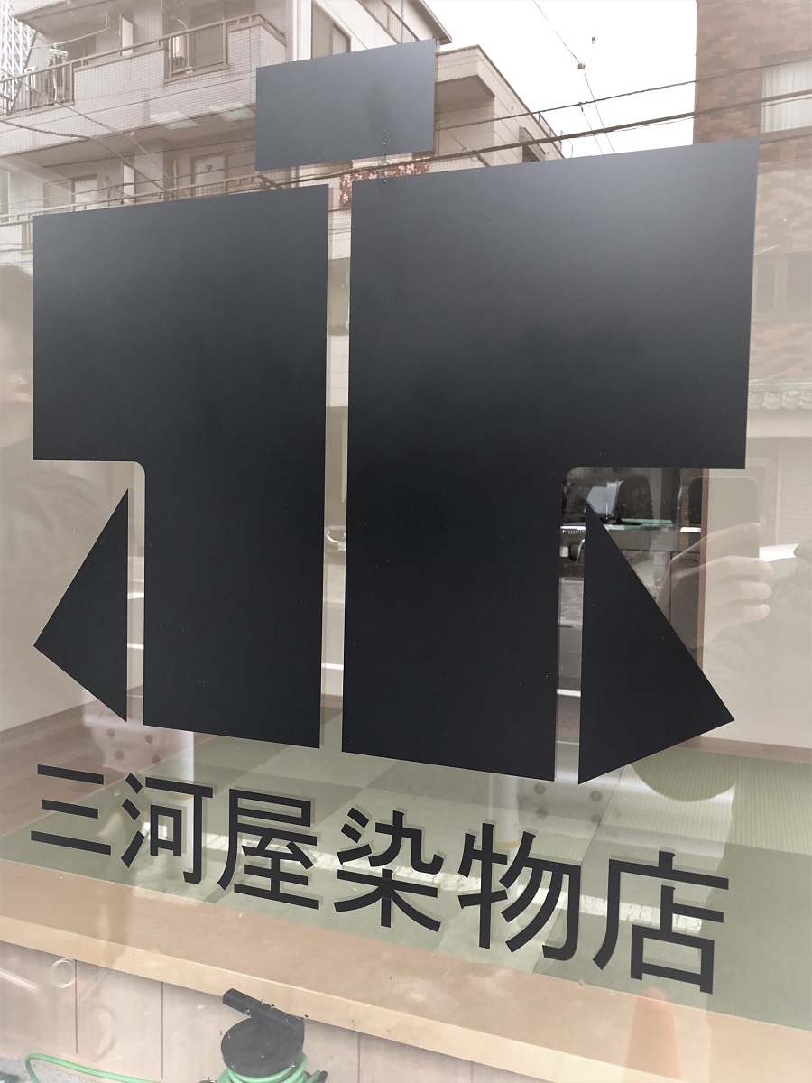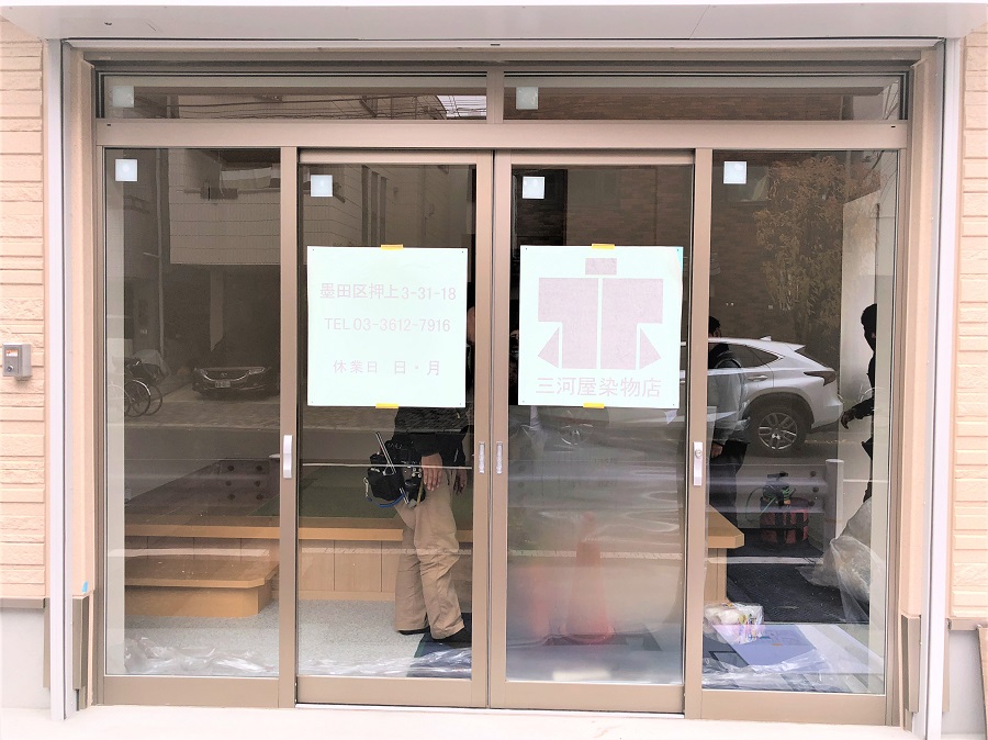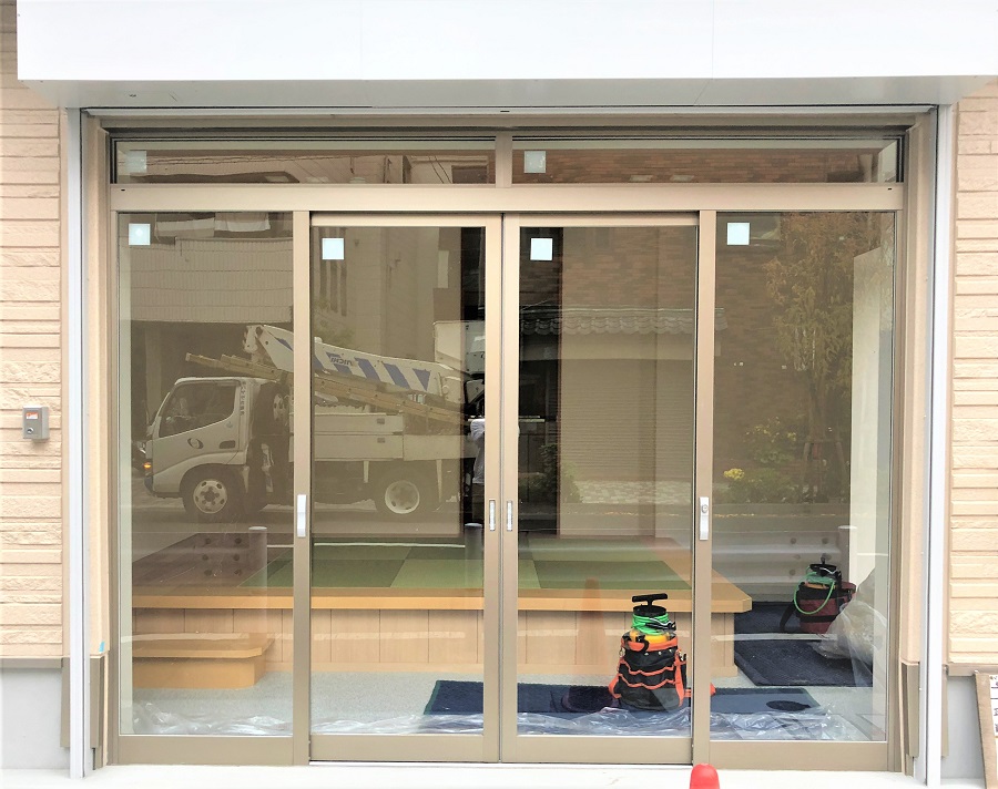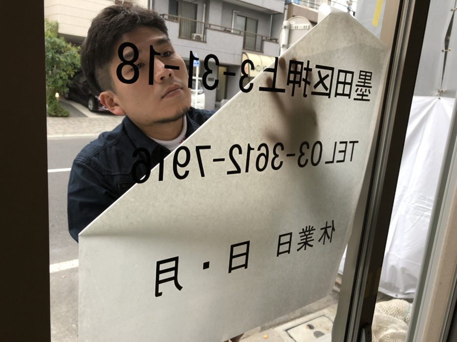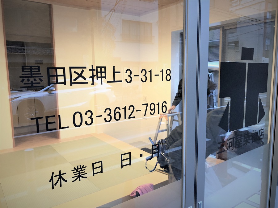 ‍店舗入り口の引き違いガラス戸にロゴ、店舗情報。下半分には目隠しフィルム。