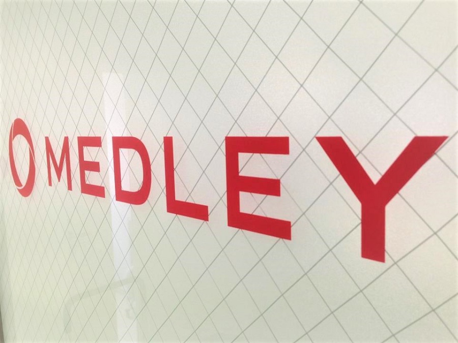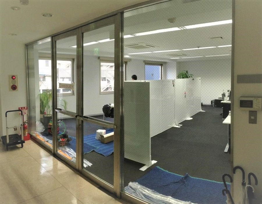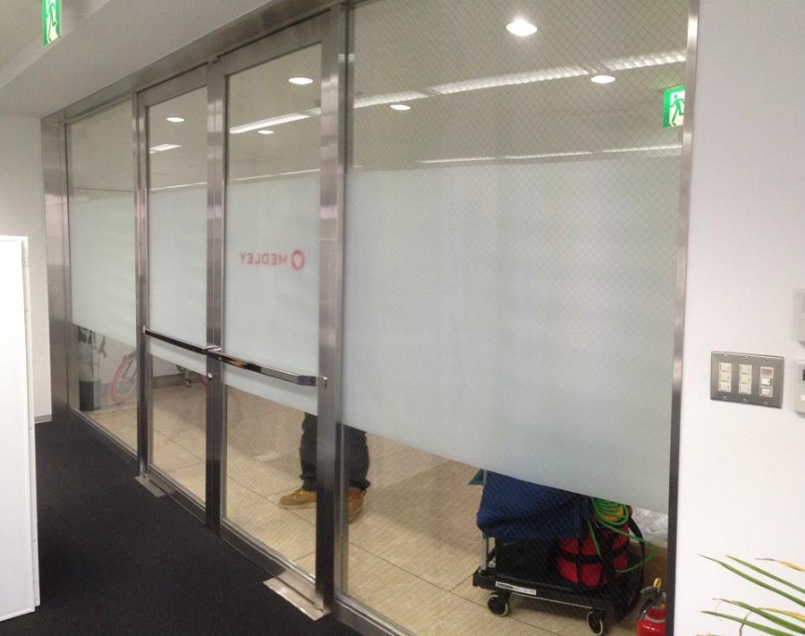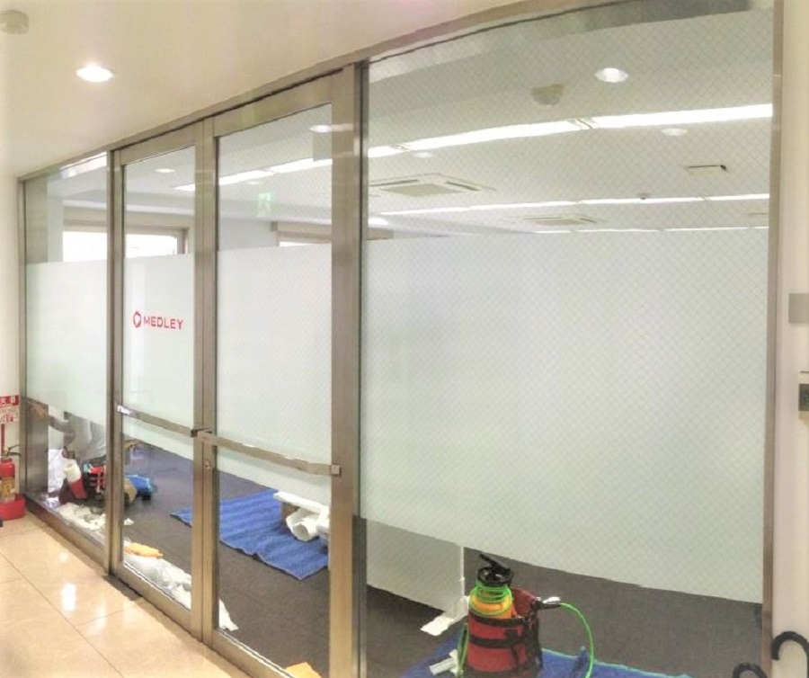‍オフィス入口のガラス窓部分に目隠しフィルムとカッティングシートを貼付。