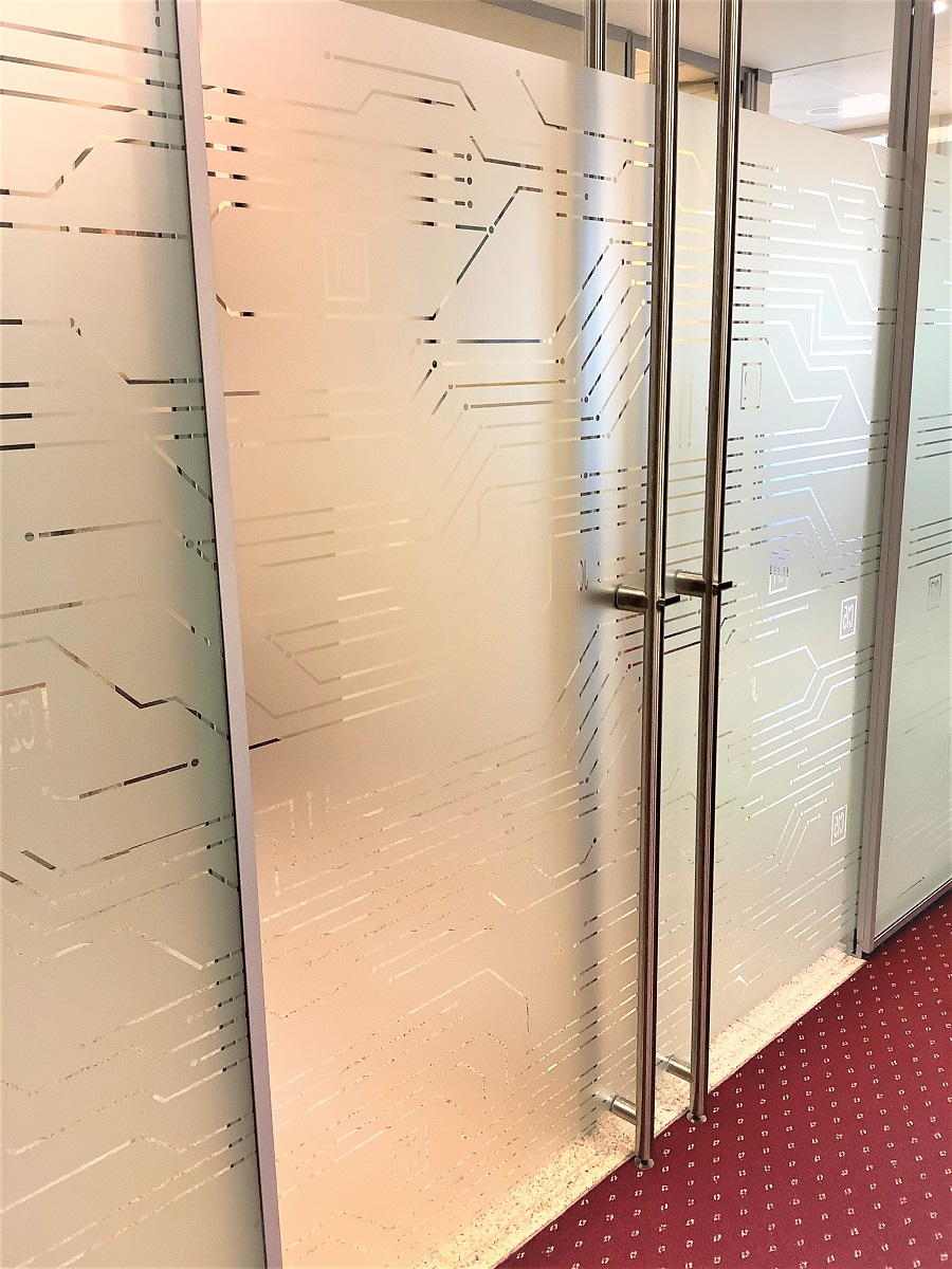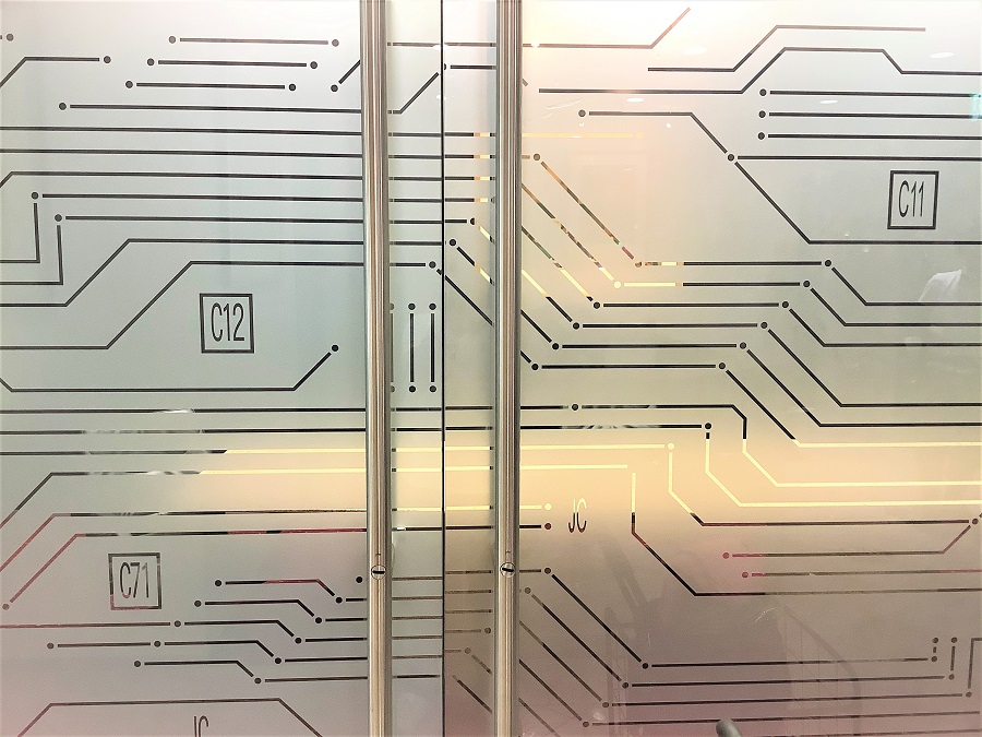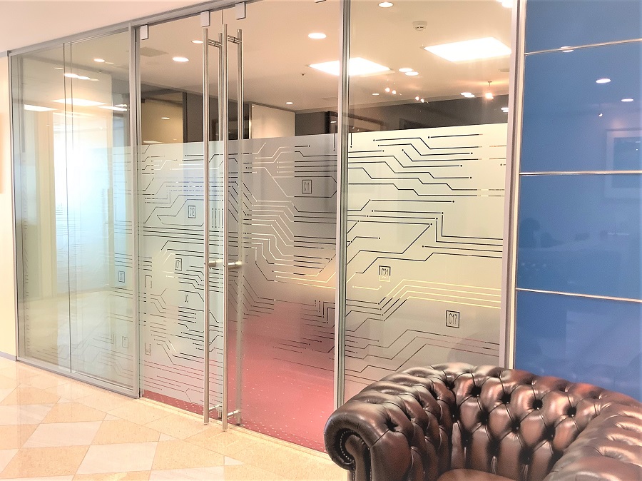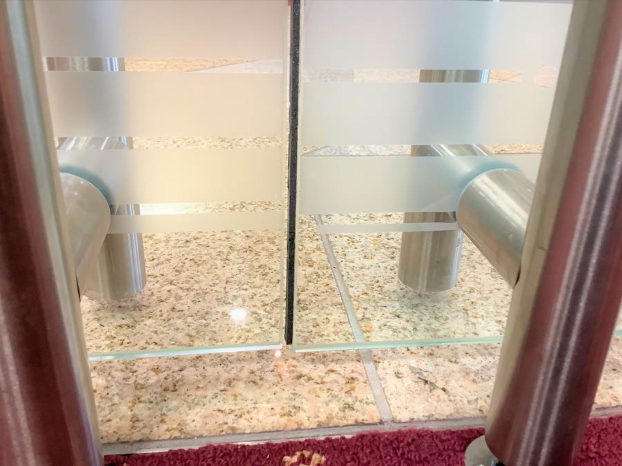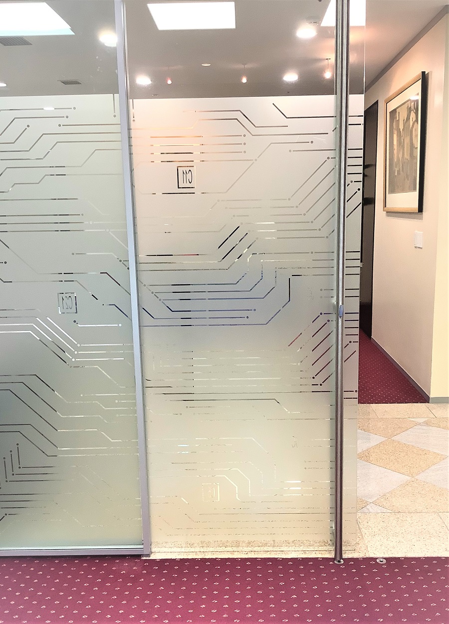 ‍施設入り口のガラス戸にカッティングシートを貼付。