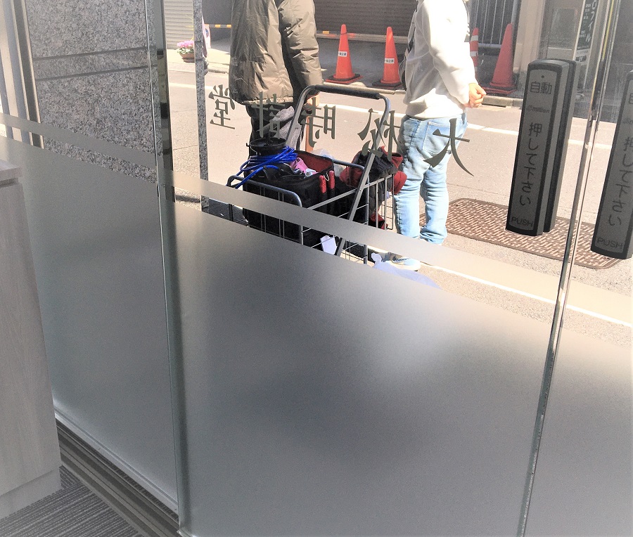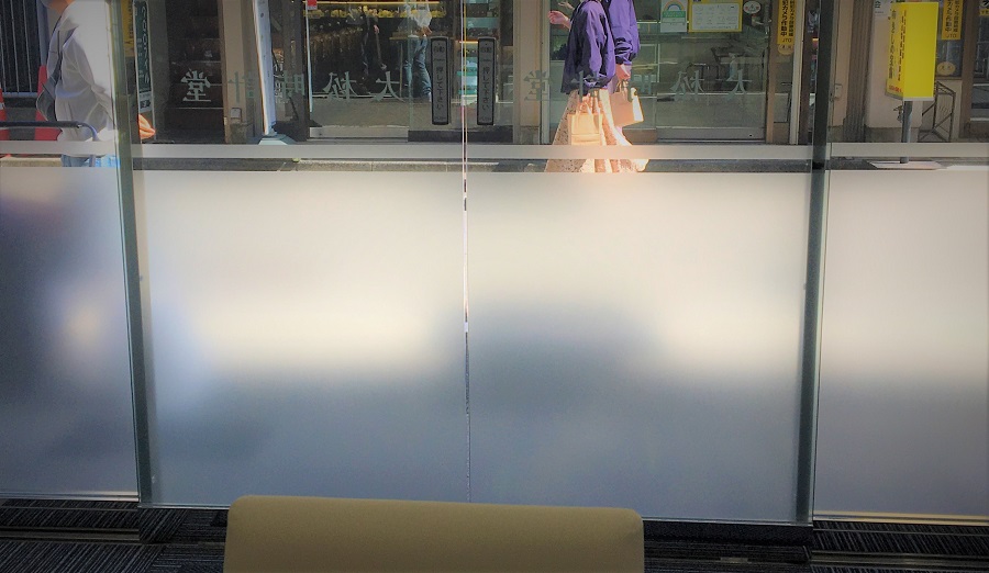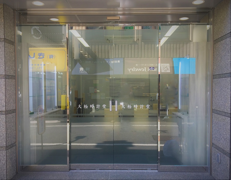 ‍店舗入り口のガラス扉およびフィクス窓に、目隠しフィルムと店名ロゴのカッティングシートを貼り付け。