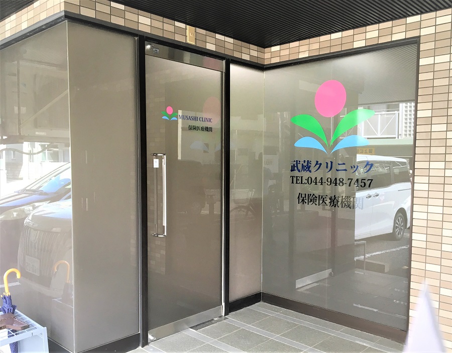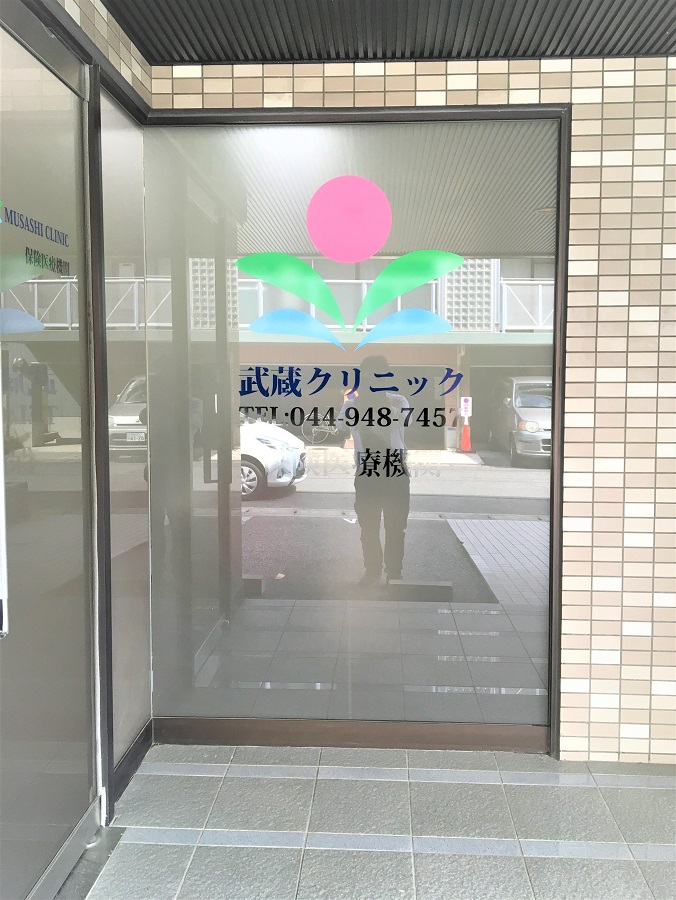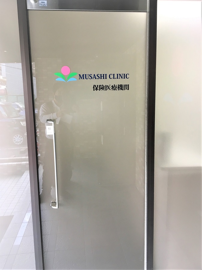 ‍クリニックの扉、表側のガラス面にカッティングシートを貼付け。