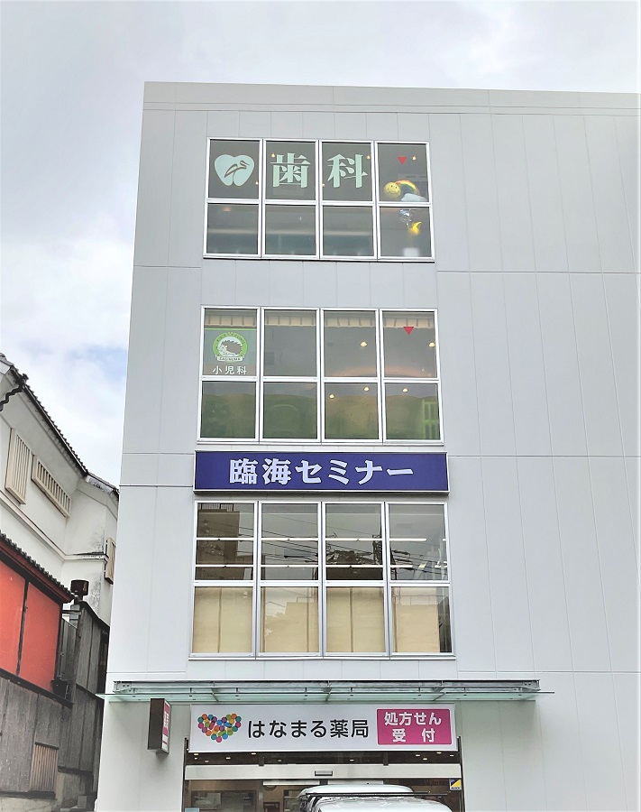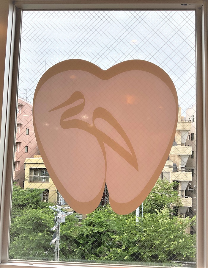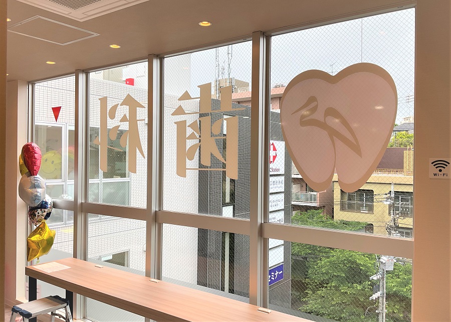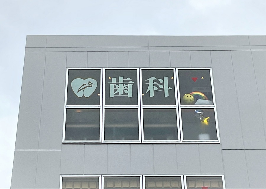 ‍ビル上層階のクリニックの窓にオリジナルカッティングシートを貼付け。