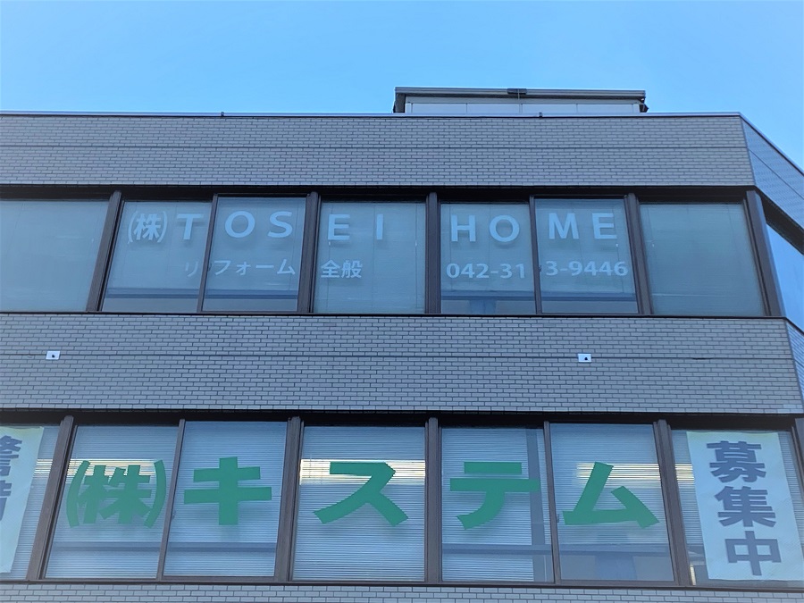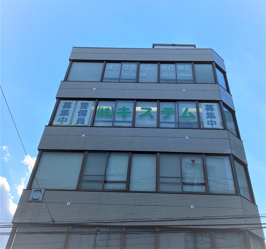 ‍ビル上層階のオフィス窓に社名電話番号をカッティングシートにて貼付け。