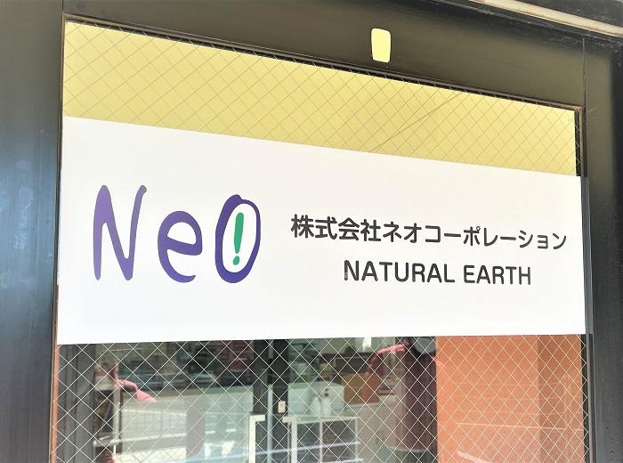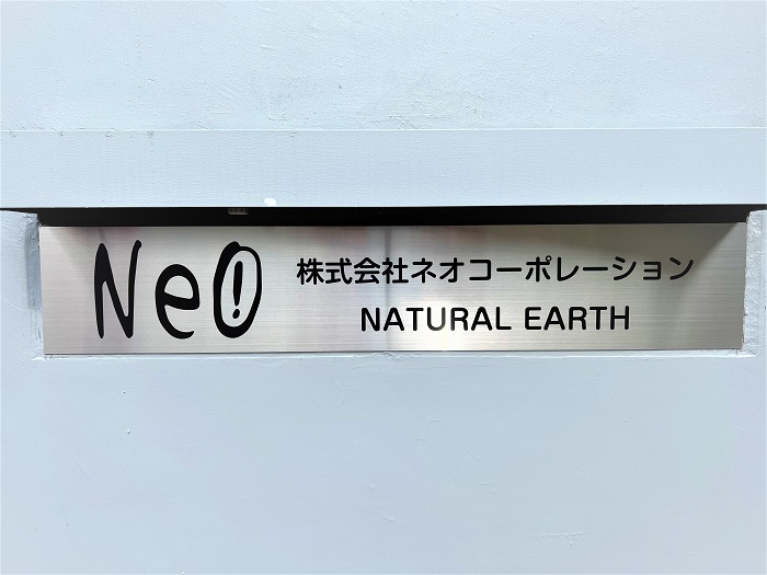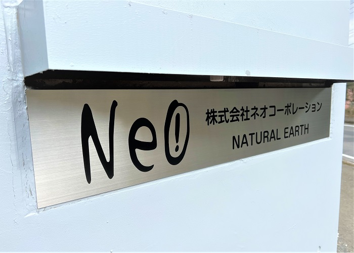 ‍施設入り口のアルミ製の名札にカッティングシートを貼り付け。