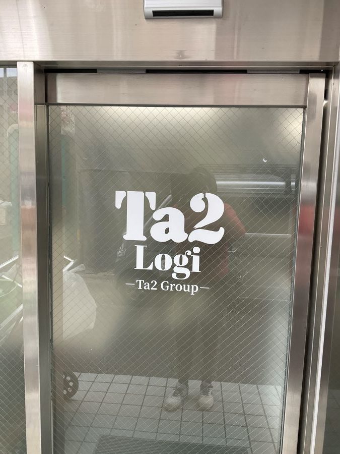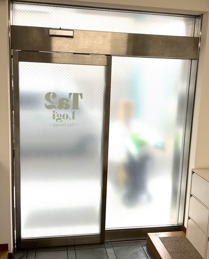 ‍オフィス入り口自動ドアガラスにカッティングシートを貼り付け。