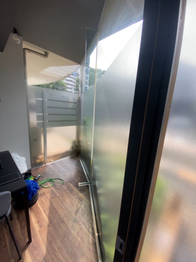 ‍こちらは室内からの様子。目隠しフィルムはサンゲツ社製『GF1869』。室内側から施工です。