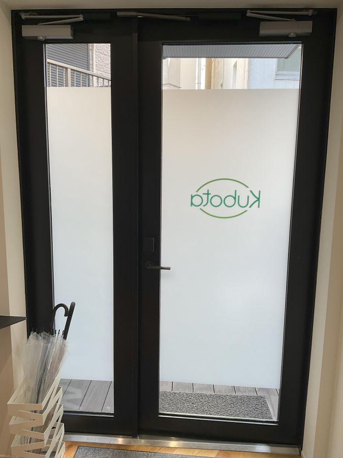 ‍オフィス入り口のガラス扉に目隠しフィルムとカッティングのロゴを施工。