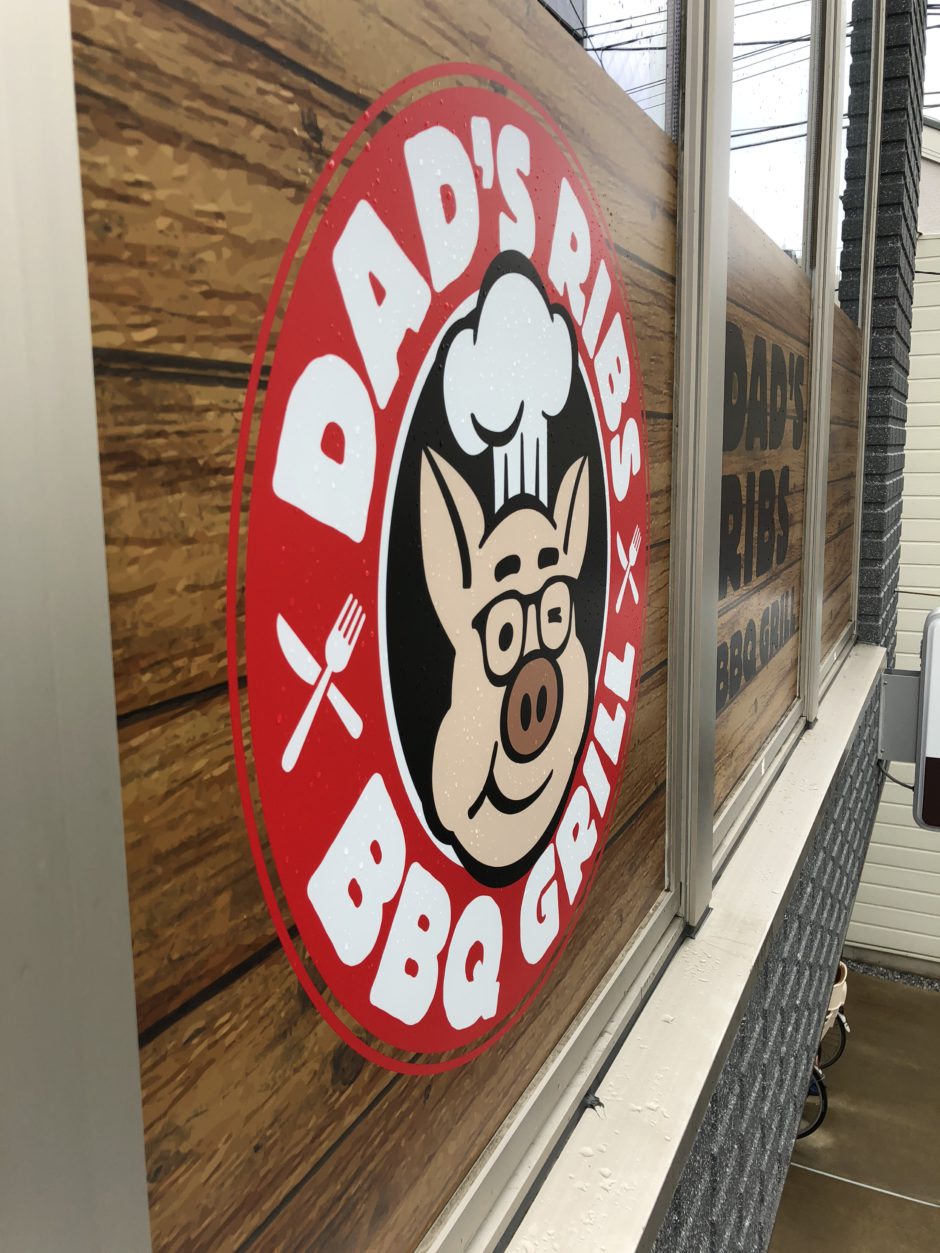 ‍背景にウッド調のグラフィックを入れることで店舗の雰囲気が出ています。これも窓プリントシートならでは。
