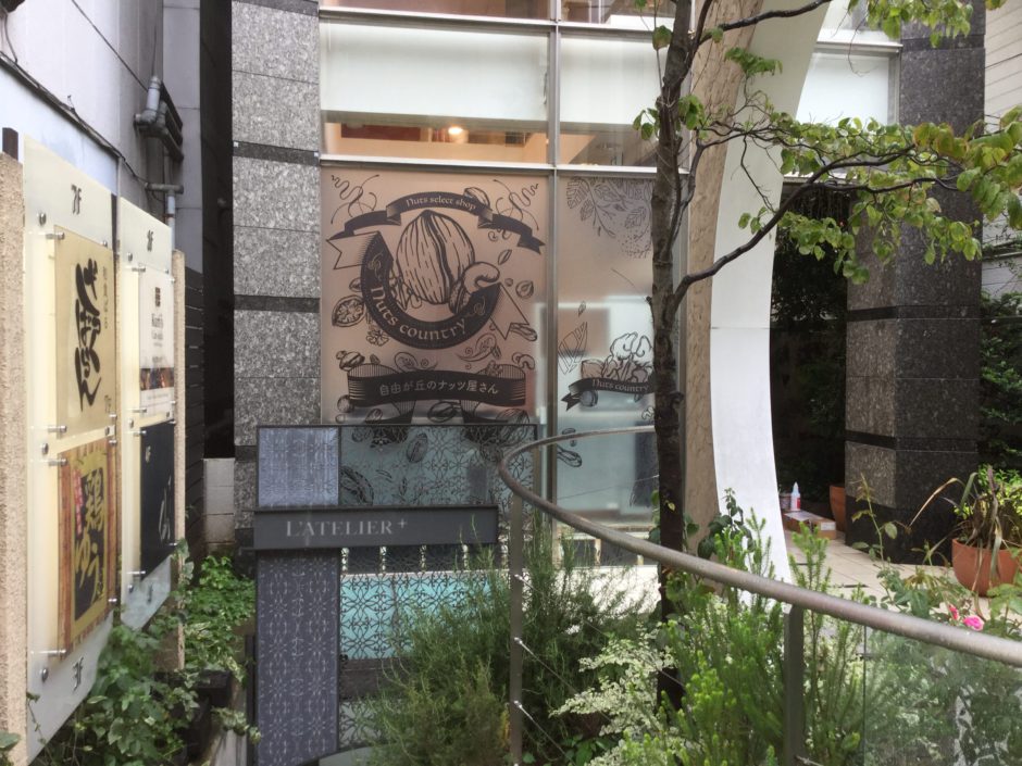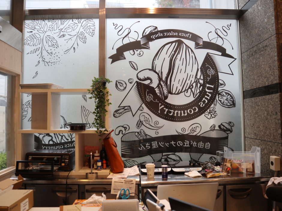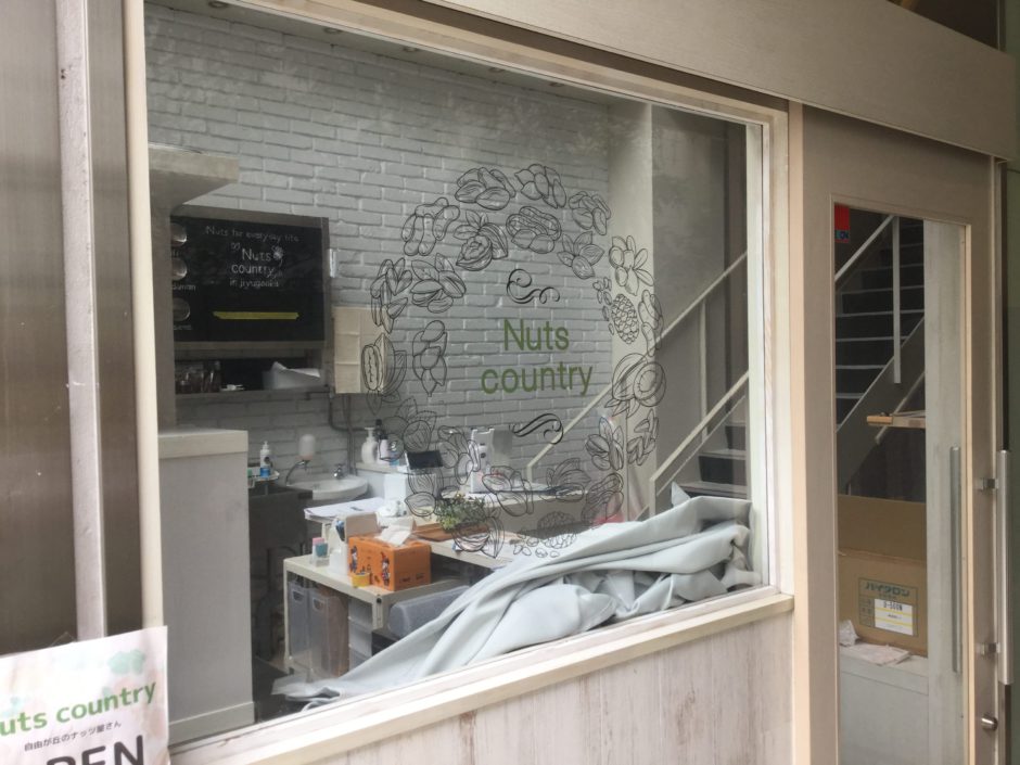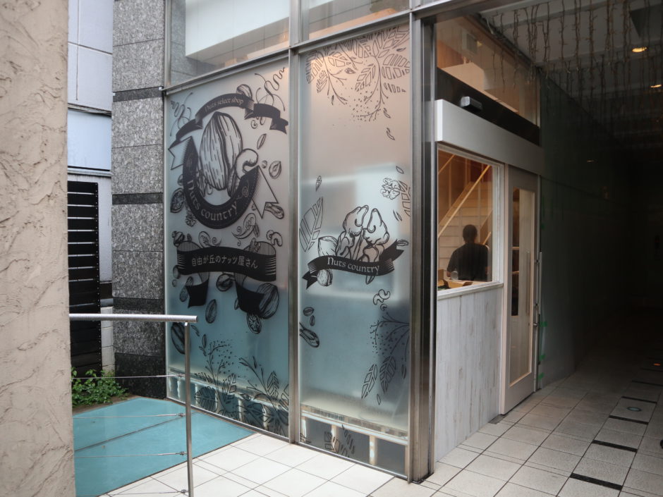 ‍店舗入口。ここにも別の繊細かつキュートなグラフィックを窓プリントシートで貼り付けました。