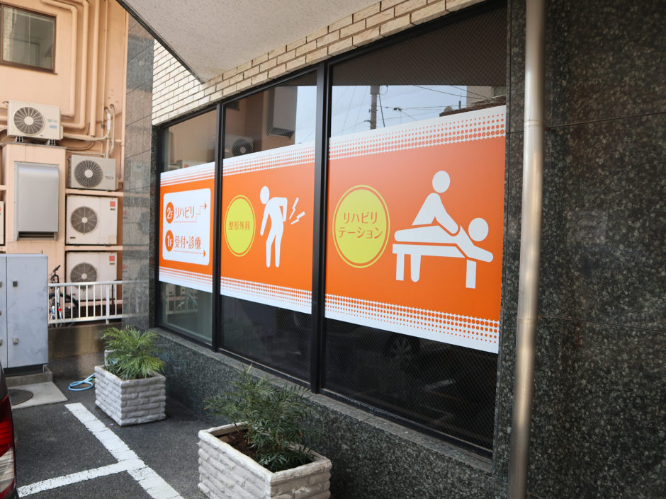 ‍シンプルなグラフィックで、遠目からでも診療内容が分かります。文字やグラフィックなど情報の要素が多い場合、窓カッティングシートではなく窓プリントシートで印刷&施工します。