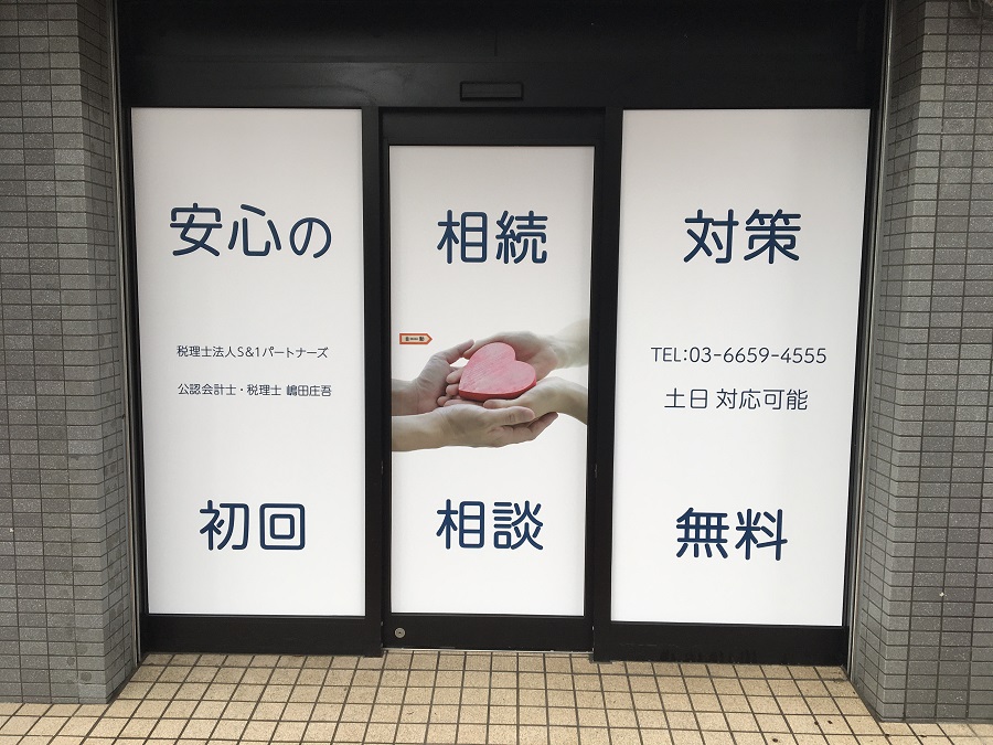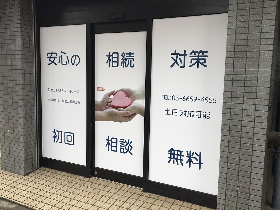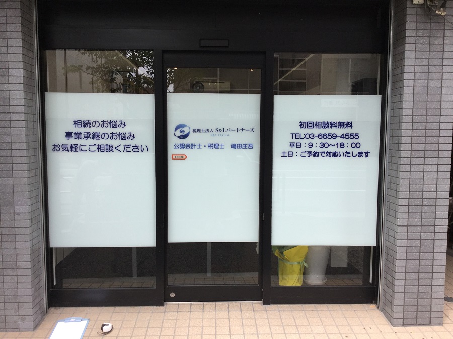 ‍路面側事務所正面の窓部分に、大きくオリジナルのプリントを貼付。