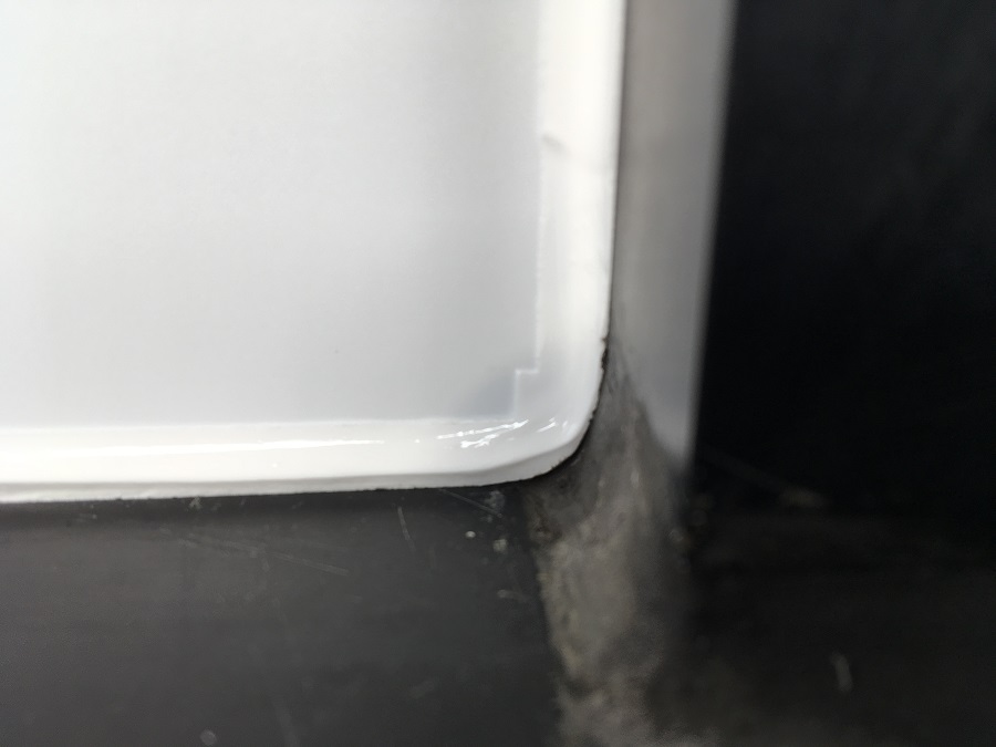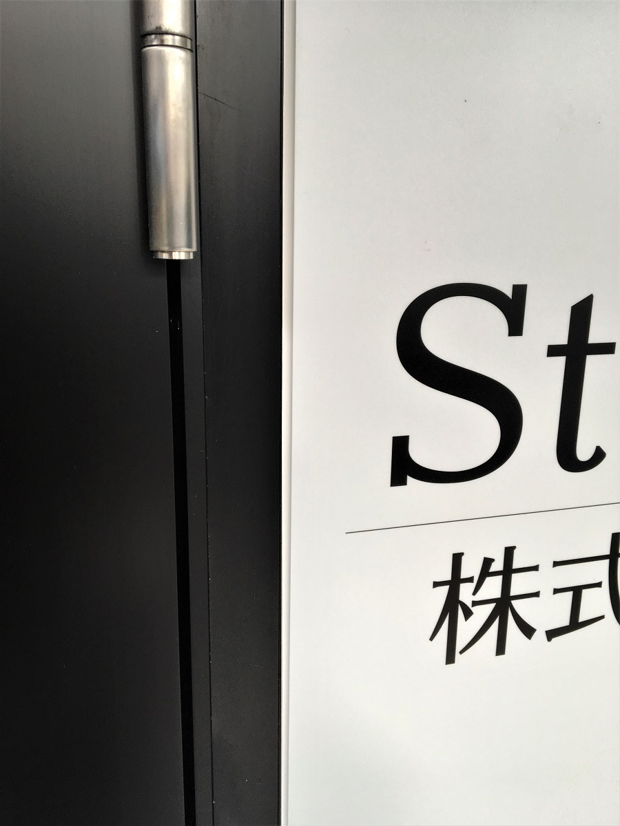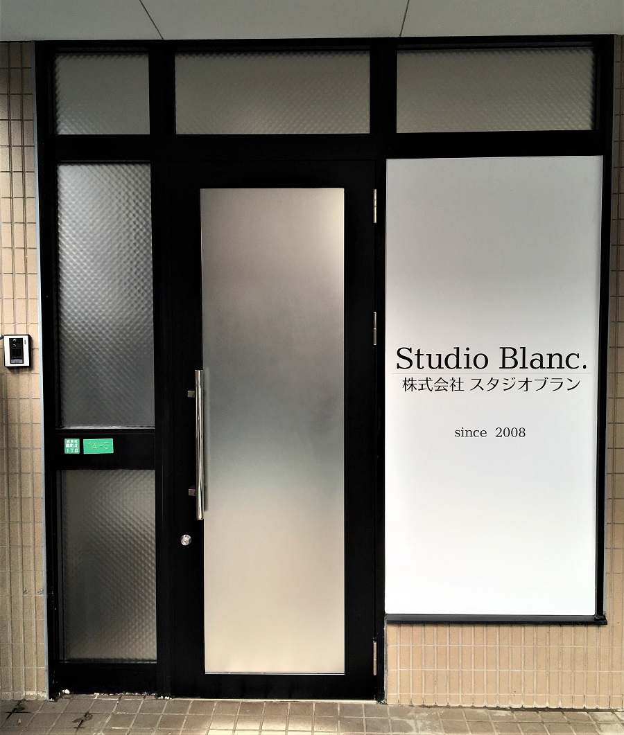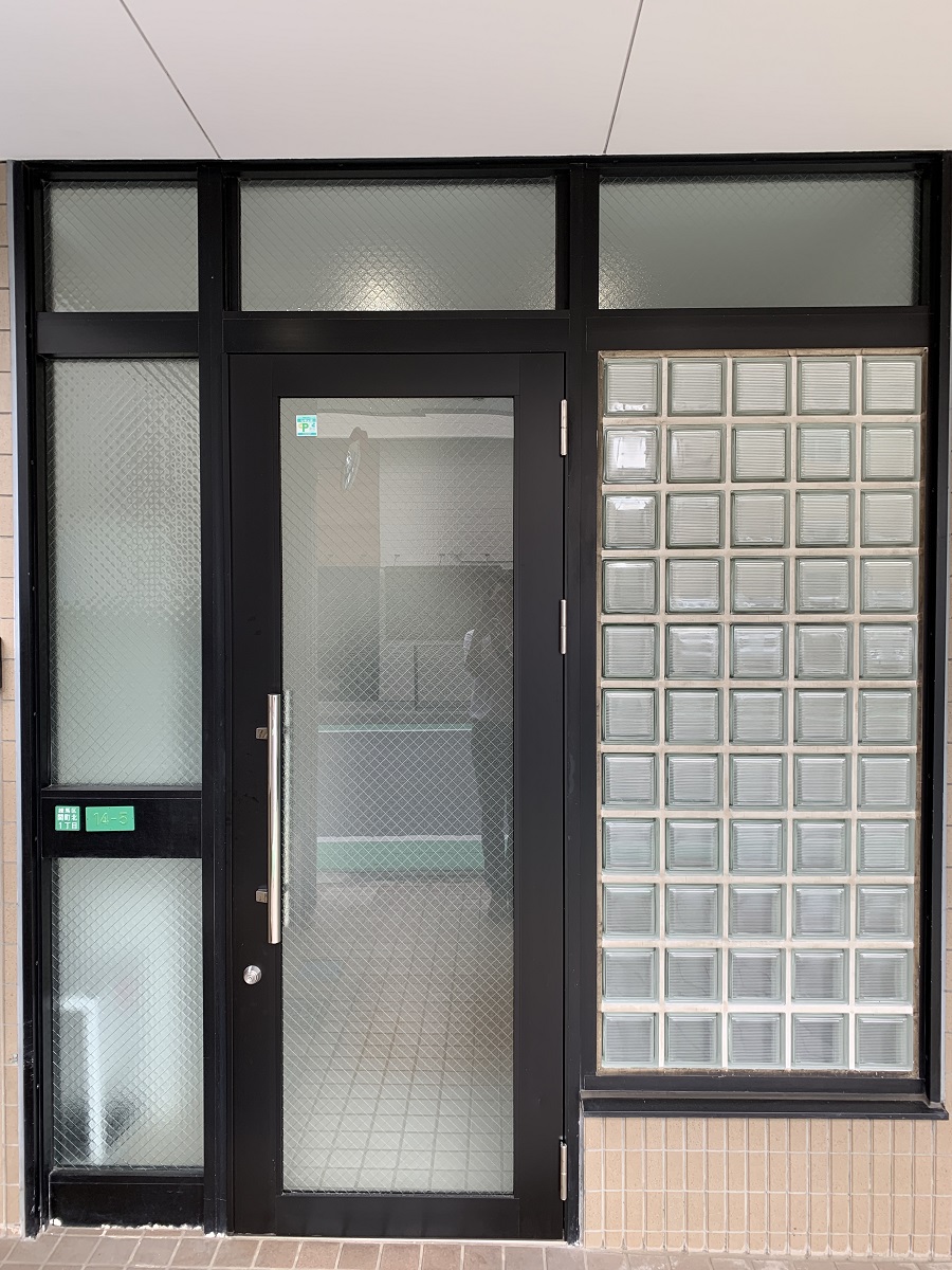 ‍入口ドアの窓部、上部、向かって左側にフロストシルバー、右側にオリジナル白マットラミを貼付。