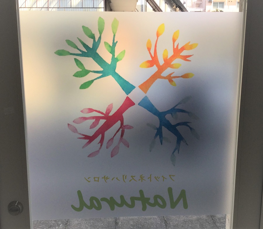 ‍ロゴマークと店名。透明マットプリントで。