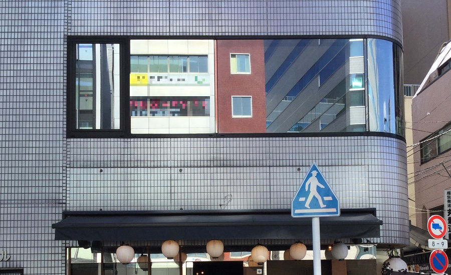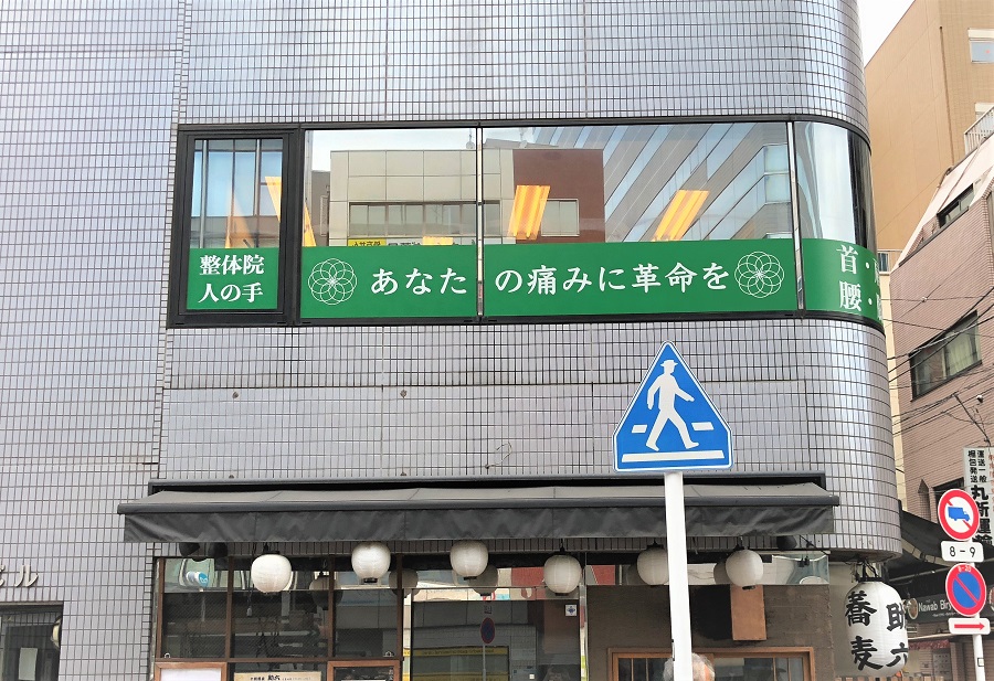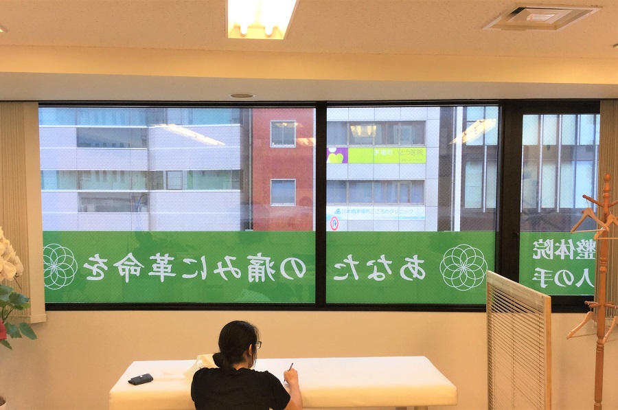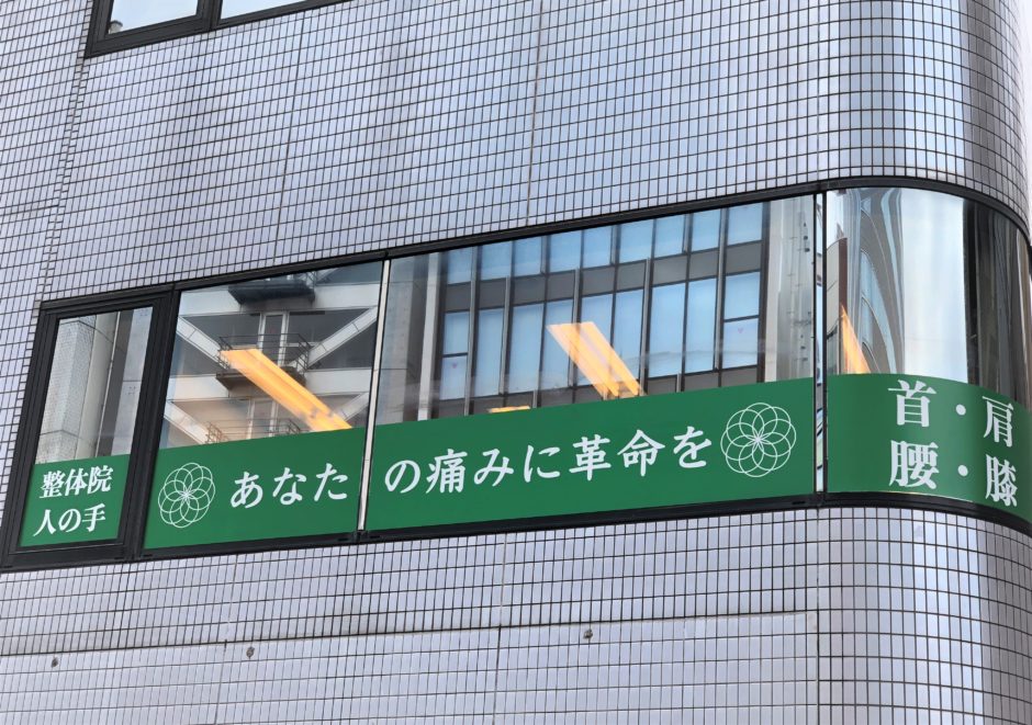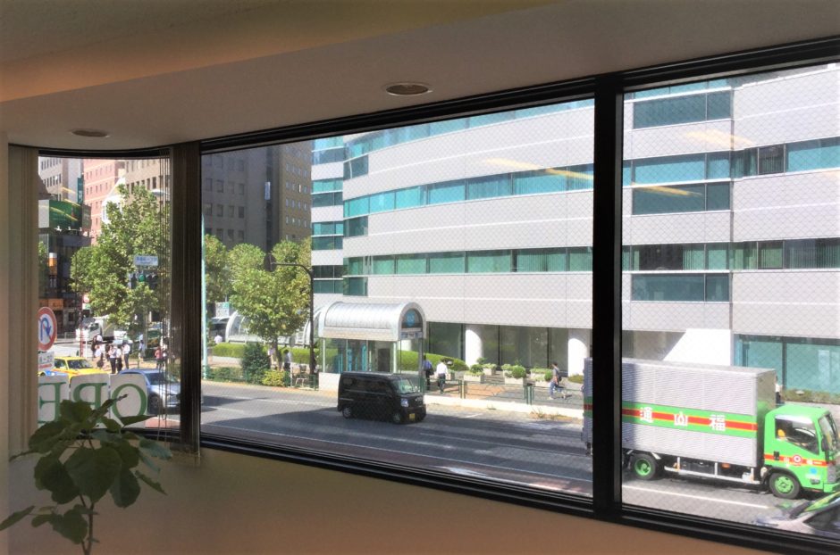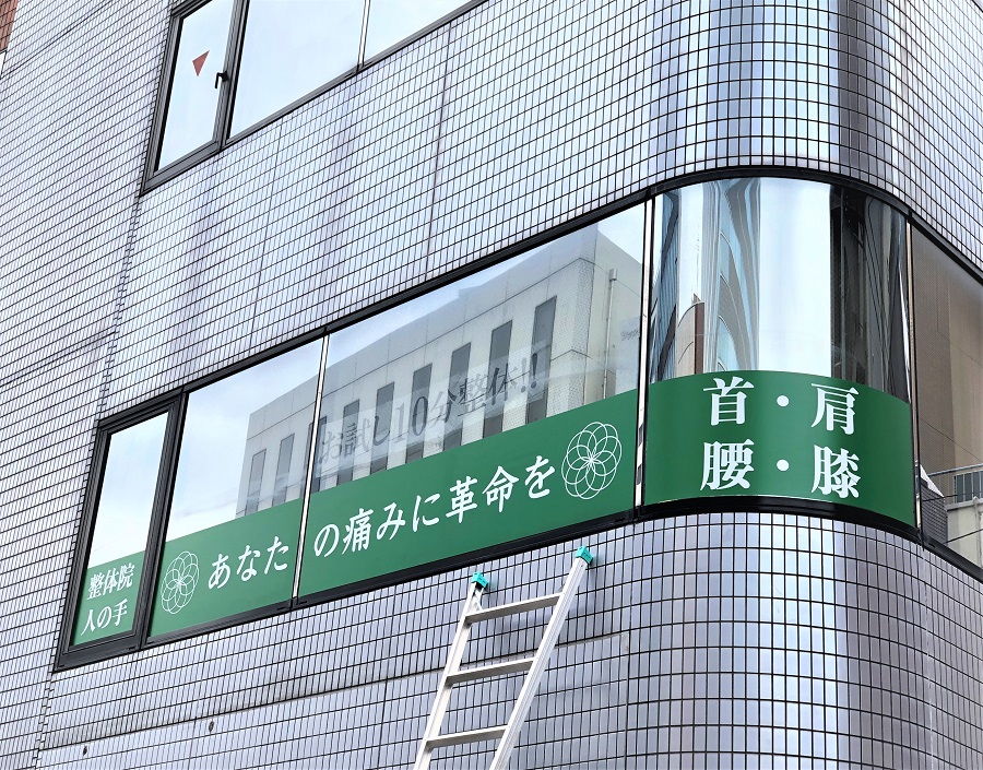 ‍ビル2階。縦滑り窓、FIX窓にキャッチフレーズのプリントフィルムを。