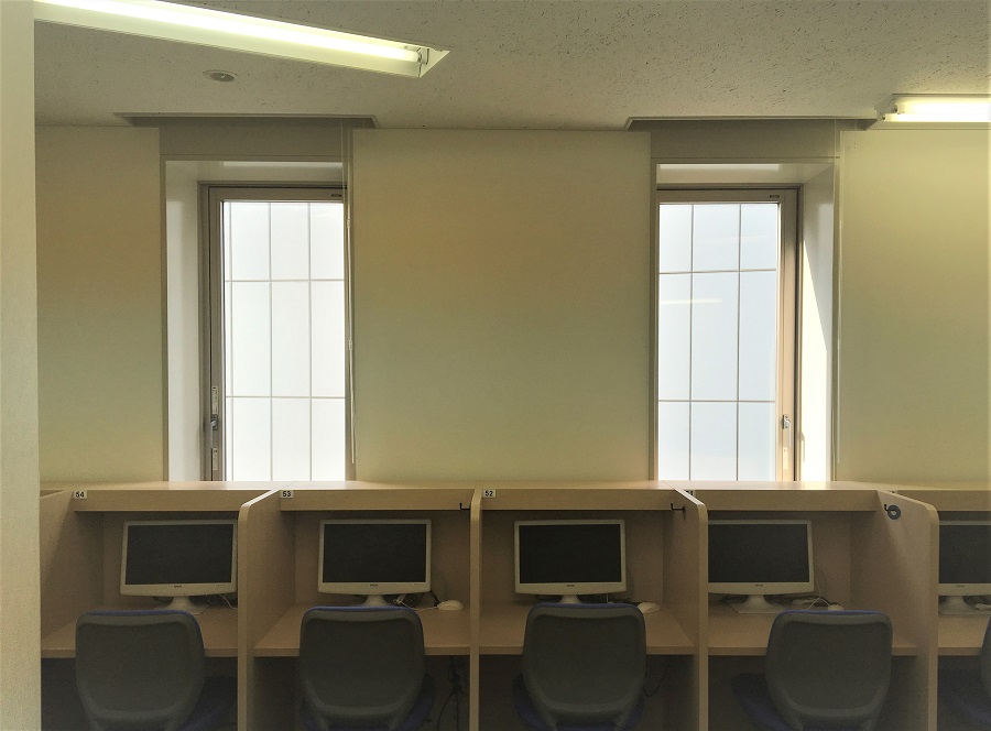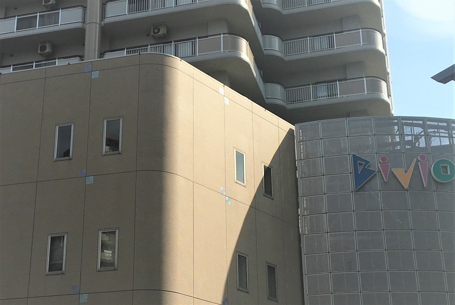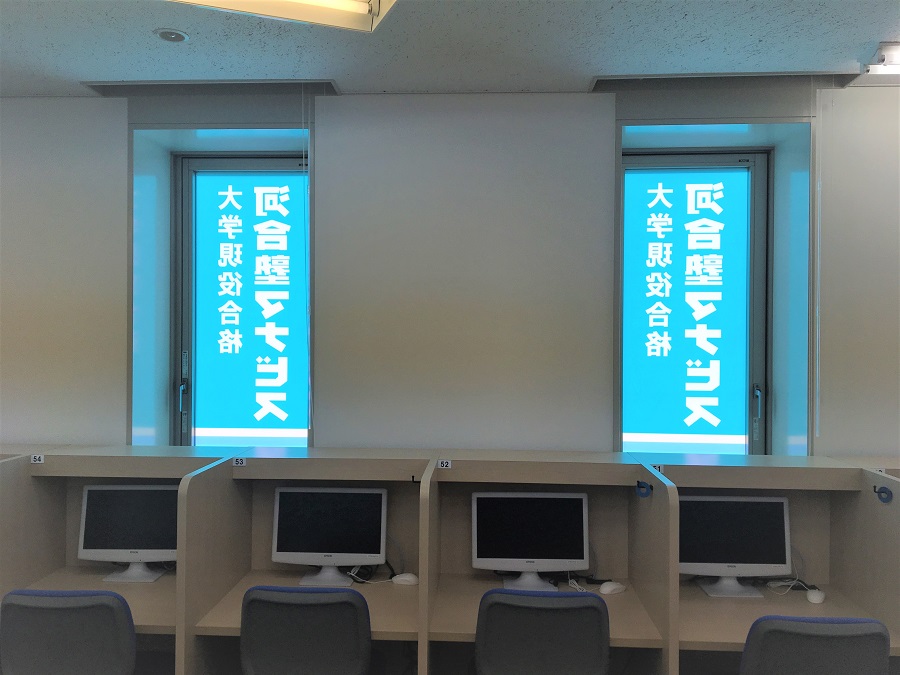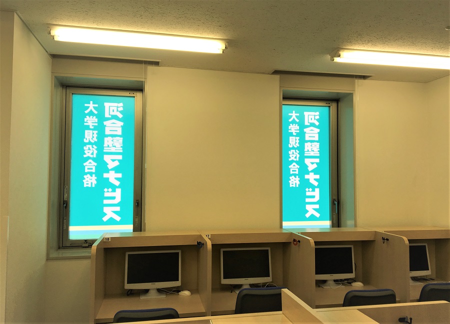 ‍ビルの窓部にオリジナルプリントフィルムを貼り付け。