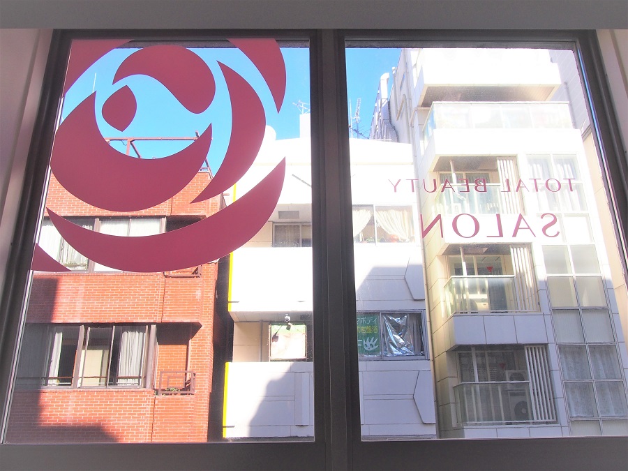 ‍ビル上層階にくっきりとオリジナルプリントシートを貼付。