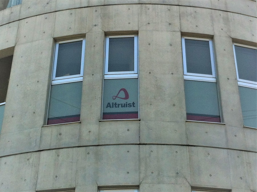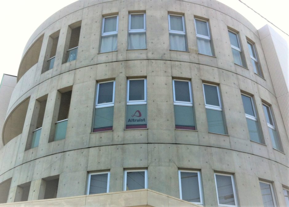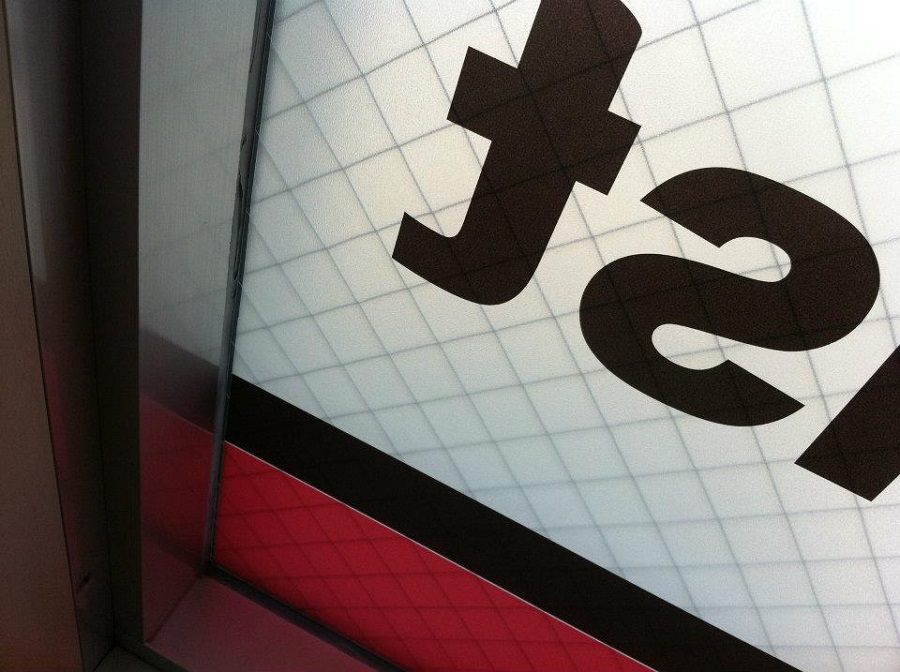 ‍ビル上層の窓部にオリジナルプリントシートを貼付。