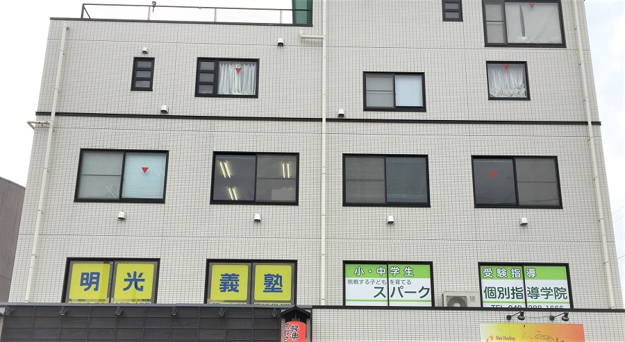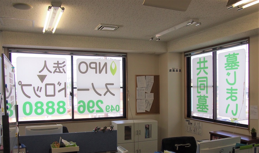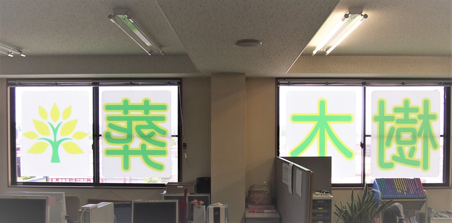 ‍ビル3F、オフィス窓部にオリジナルプリントシートを貼付。