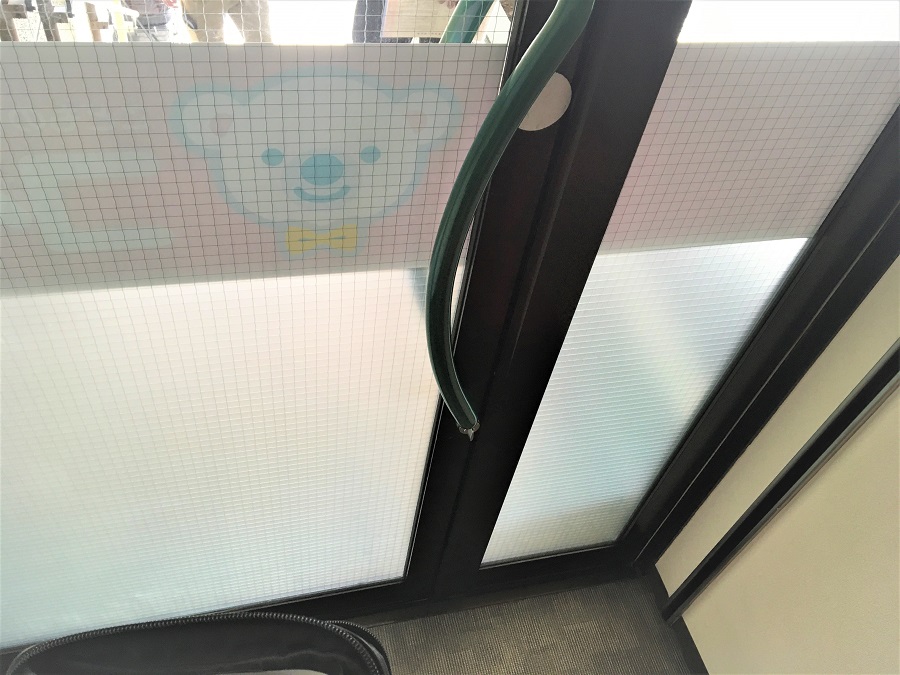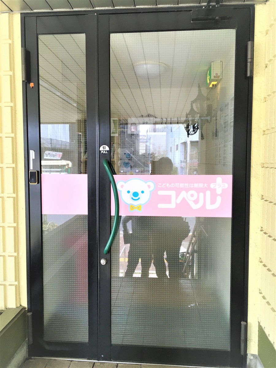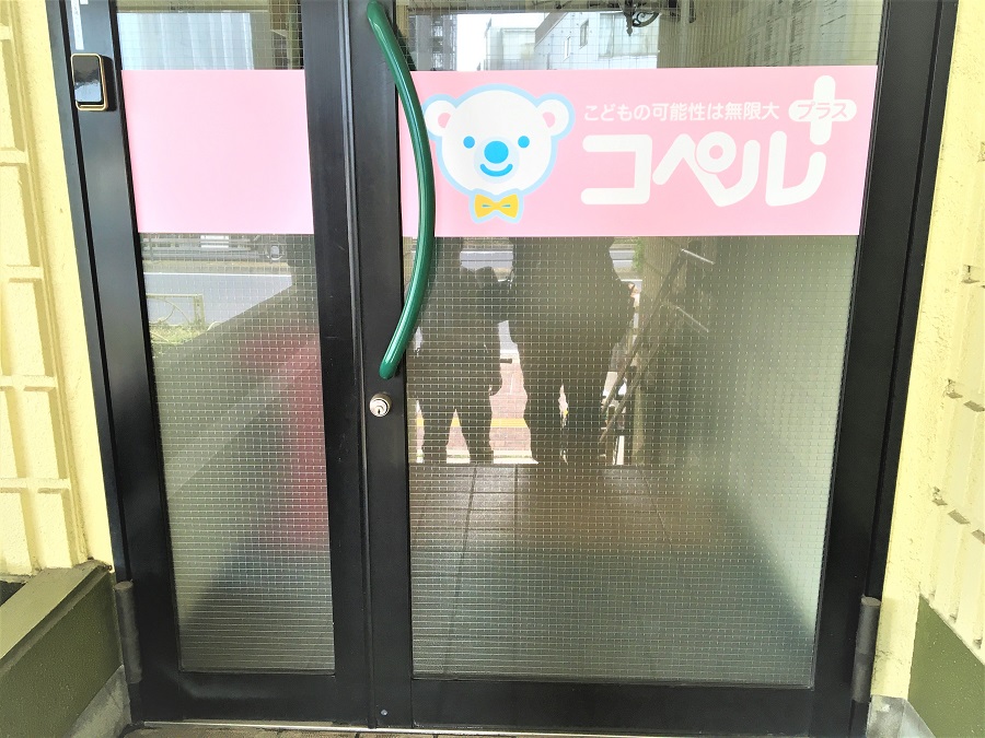 ‍施設入り口の窓扉に帯状のオリジナルプリントを。お持ち込みのデータで自由にデザインできます。