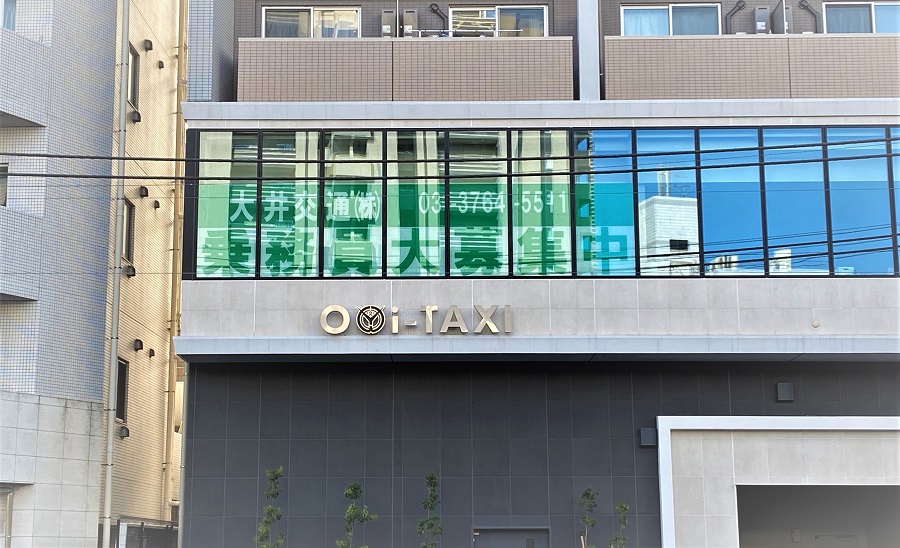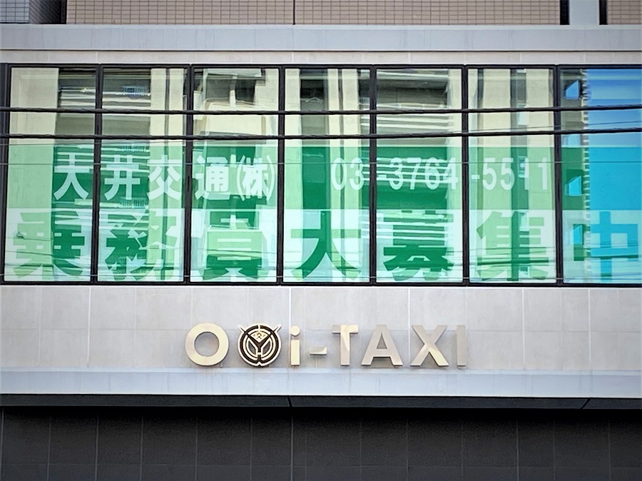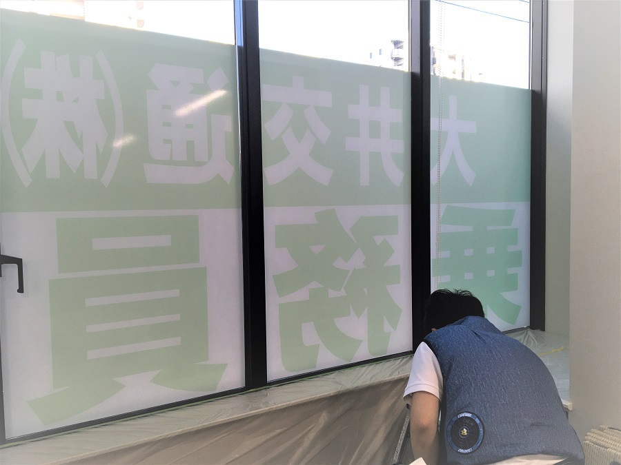 ‍ビルの窓ガラスに内貼りでオリジナルプリントフィルムを貼り付け。