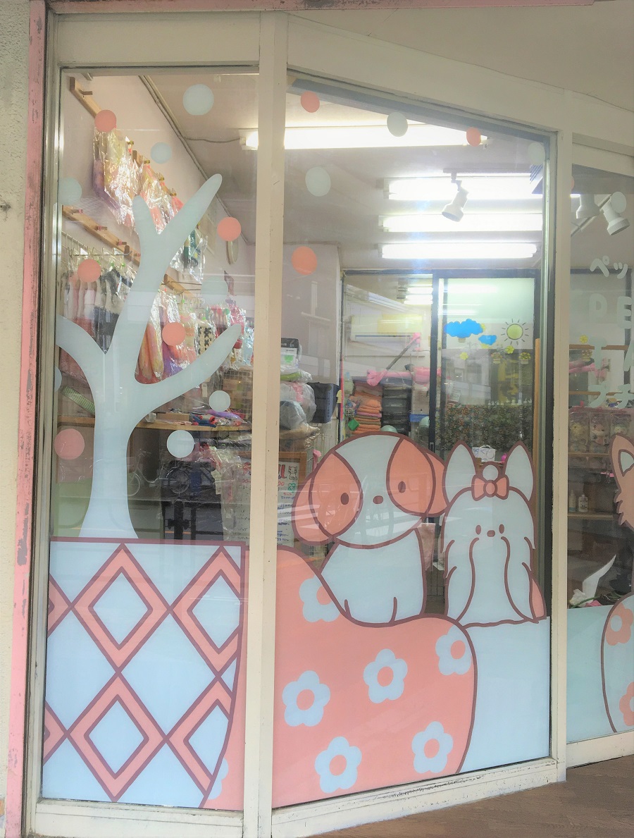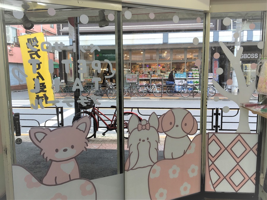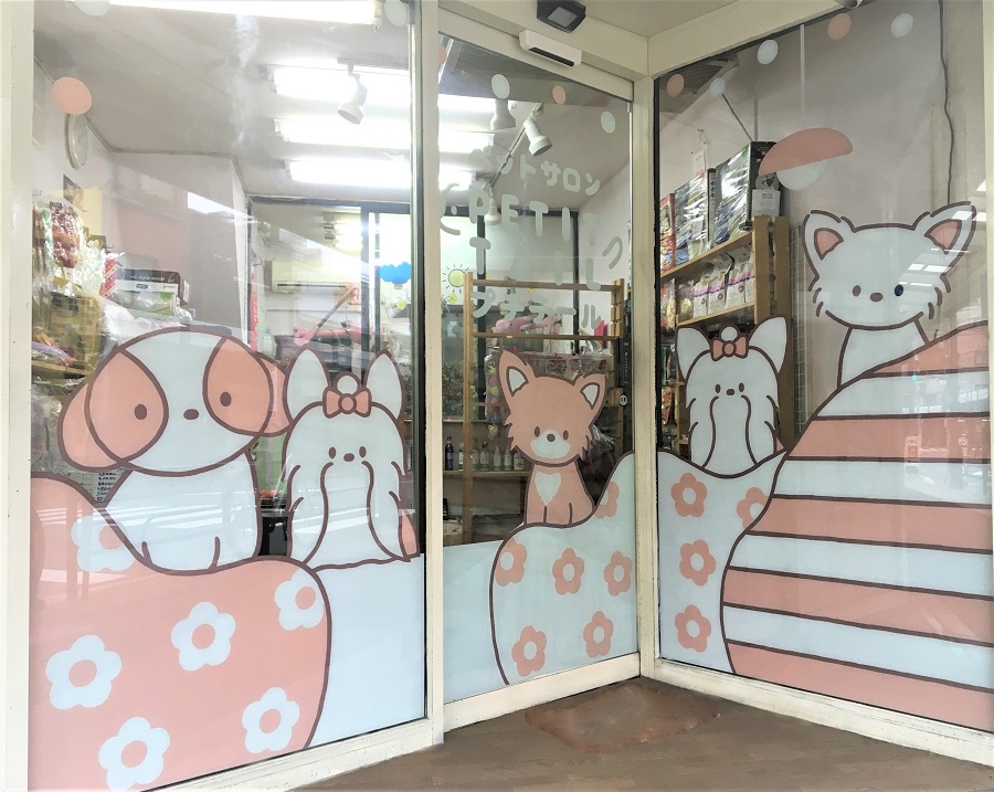 ‍店舗入り口のフィクス窓、自動ドアにオリジナルプリントシートを貼り付け施工。