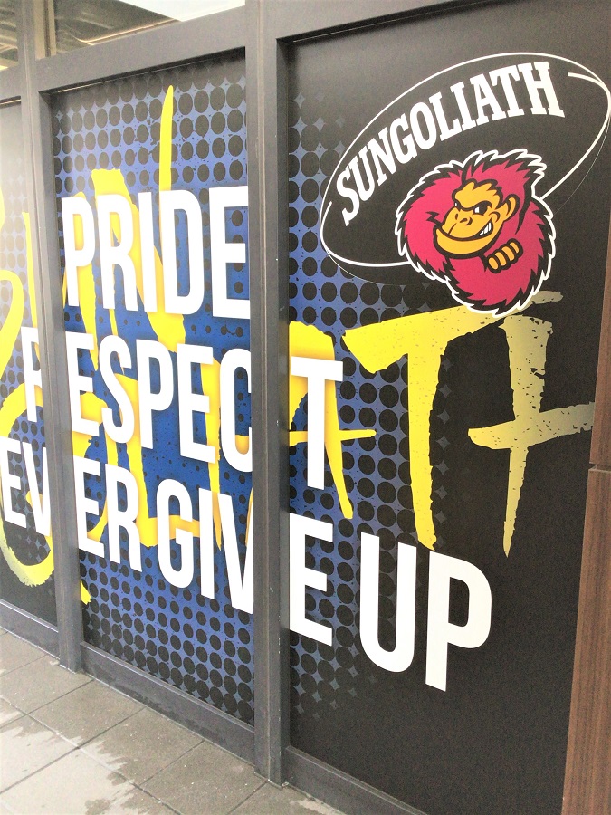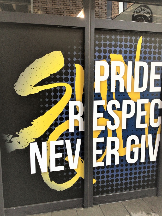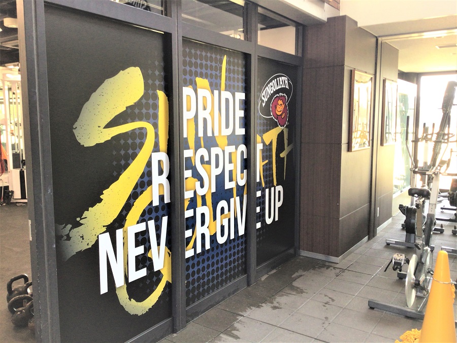 ‍ジム施設の壁面窓にオリジナルプリントシートを貼り付け。