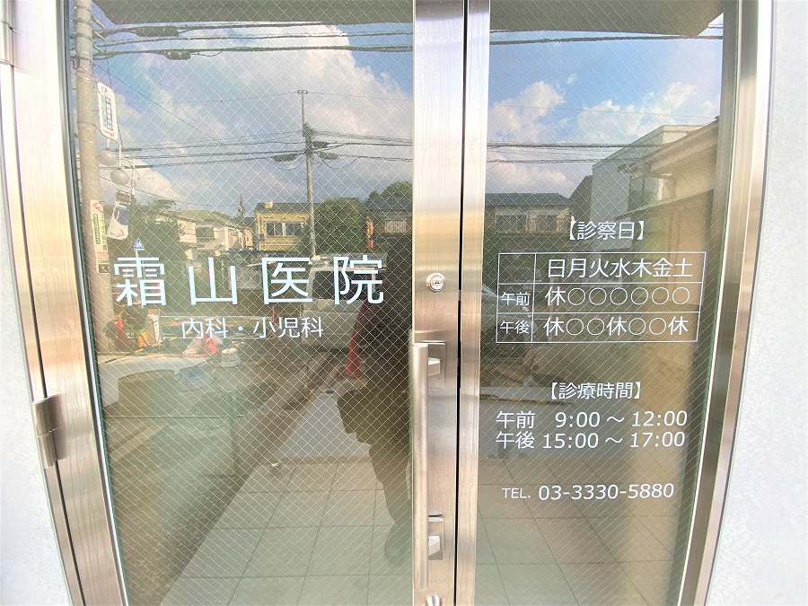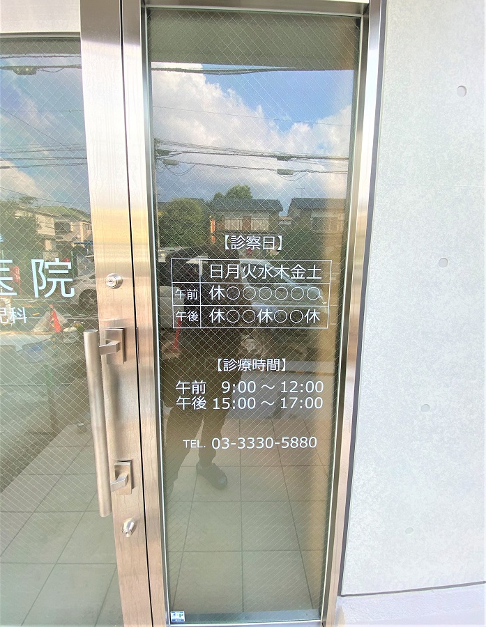 ‍クリニックの入り口ガラス扉に、医院名や診療案内を記したオリジナルプリントシートを貼付け。