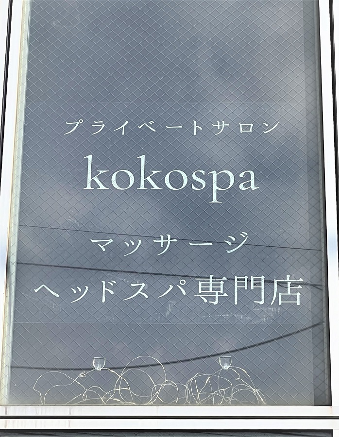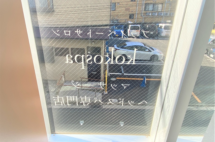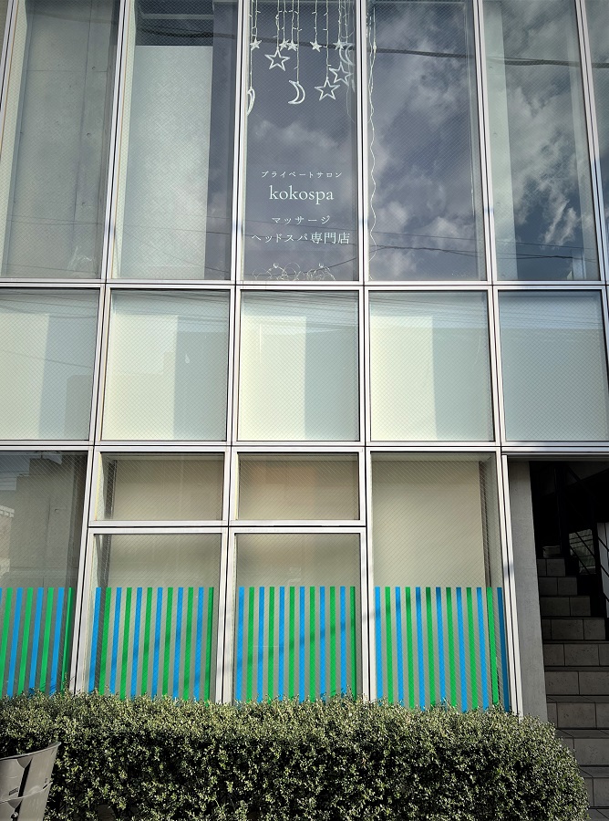 ‍ビル2階のサロンの窓に店名をオリジナルプリントシートで貼付け。