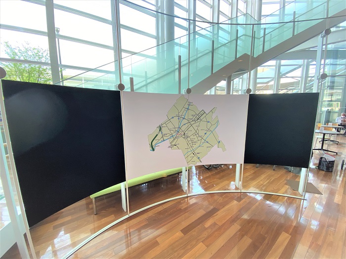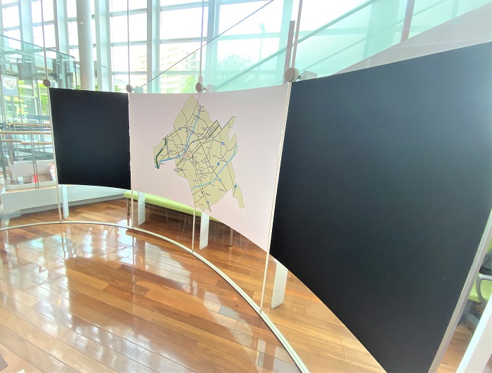 ‍アーチ状のパーティションにプリントシートを貼り付け。