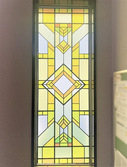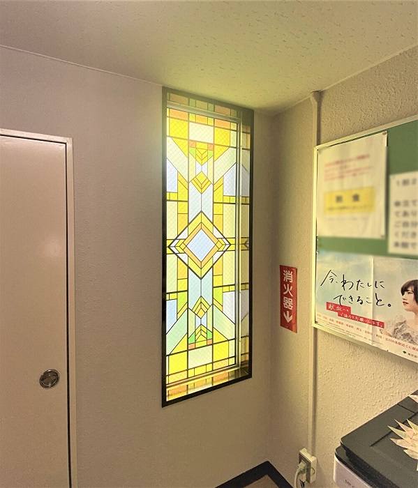 ‍ステンドグラス風のイラストをプリントシートに印刷し、窓に貼付。