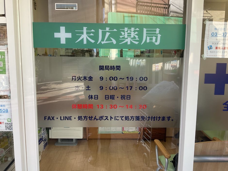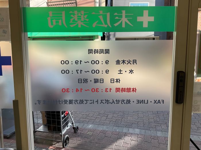 ‍薬局の自動扉部に医院案内をプリントして貼付。