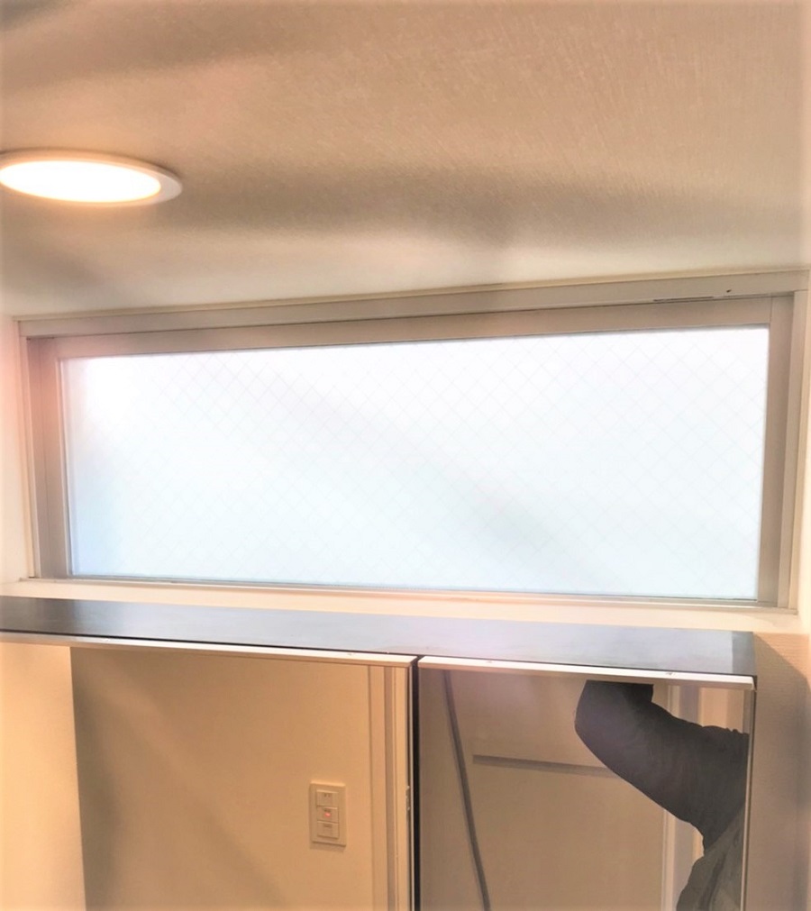 ‍横滑り窓に目隠しフィルムを貼り付け。