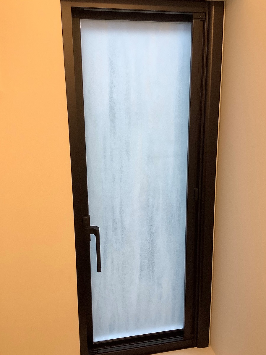 ‍横滑り窓に目隠しフィルムを貼り付け。