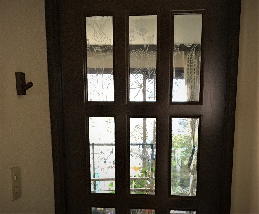 ‍住宅内、室内ドアの窓部分にデザインタイプの目隠しフィルムを貼付け。