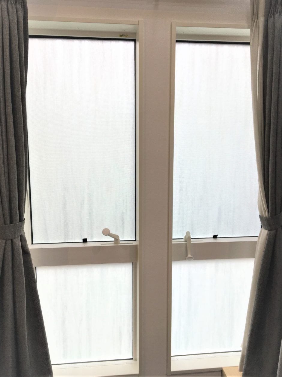 ‍住宅内、室内ドアの窓部分にデザインタイプの目隠しフィルムを貼付け。
