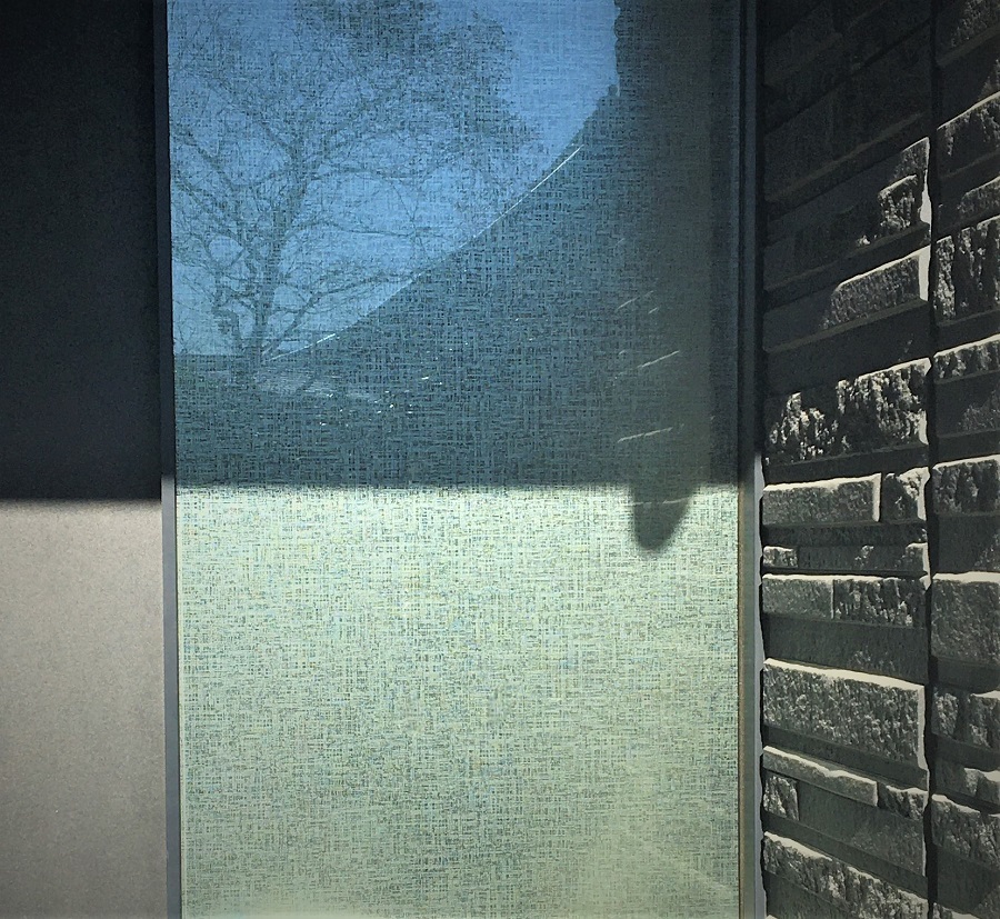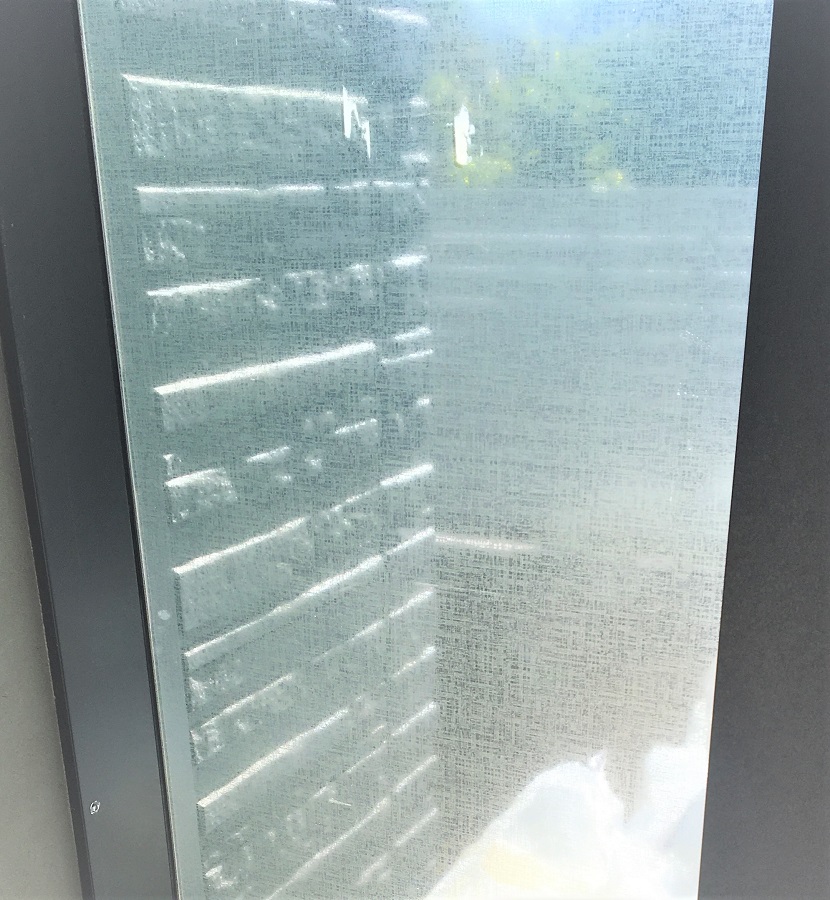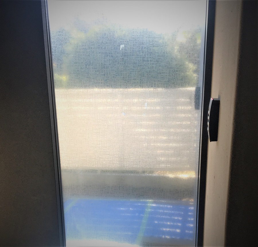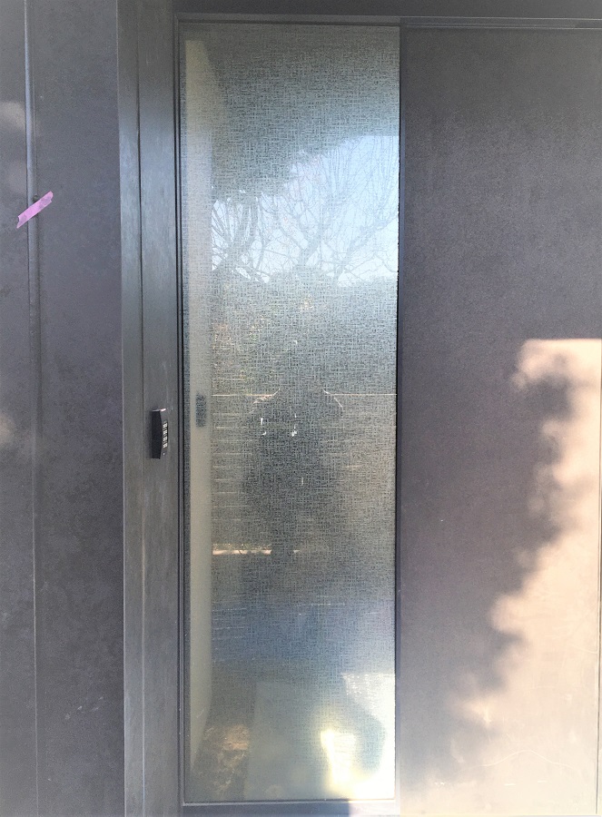 ‍マンション施設エントランスの自動ドア横のはめ込み窓に、デザインタイプの目隠しフィルムを施工。
