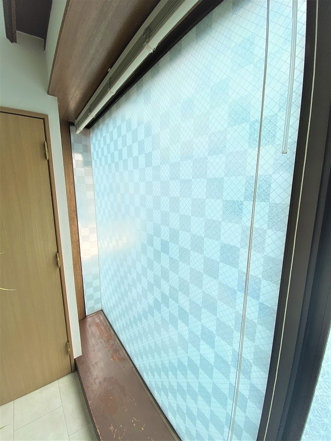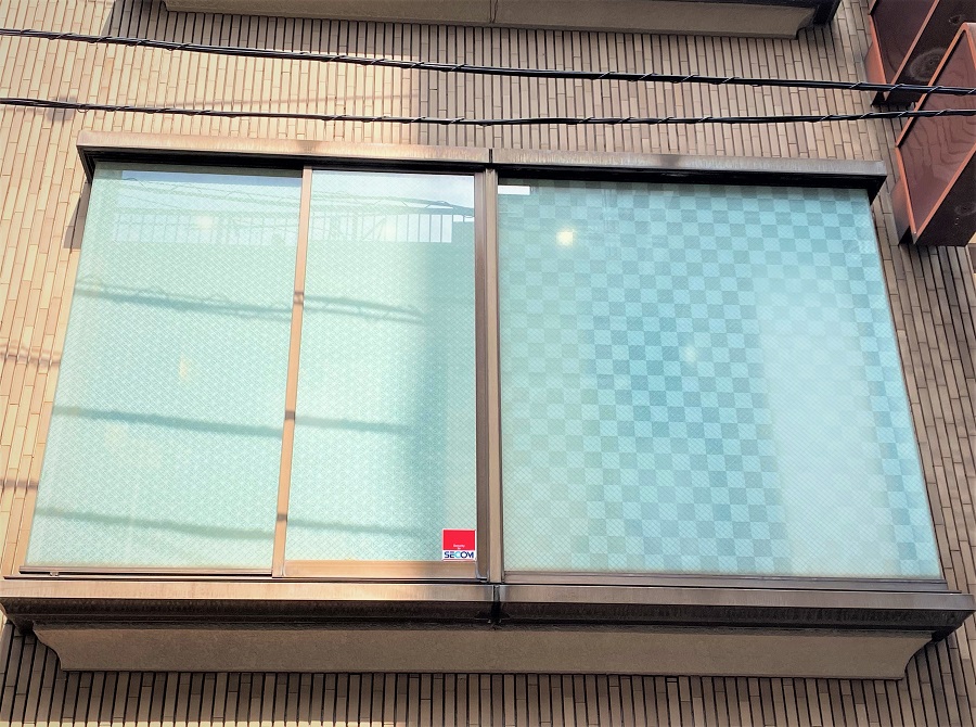 ‍ビル二階にある店舗の窓にデザインタイプの目隠しフィルムを貼付け。