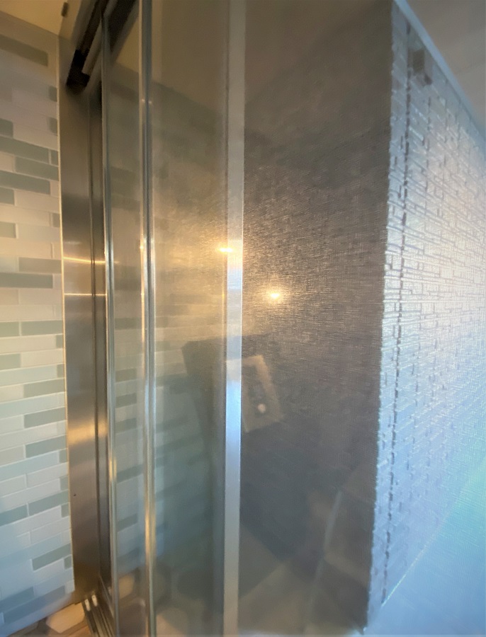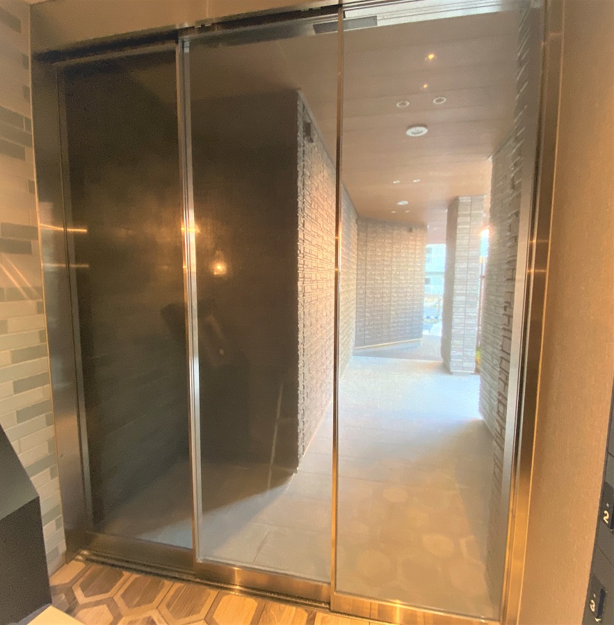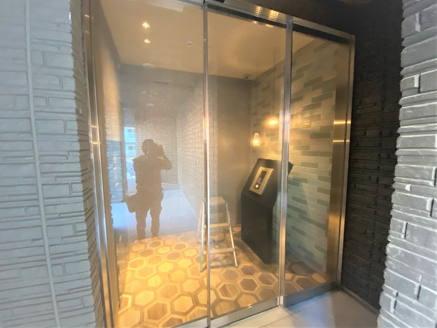 ‍マンションのエントランス自動扉の窓にデザインフィルムを貼付け。