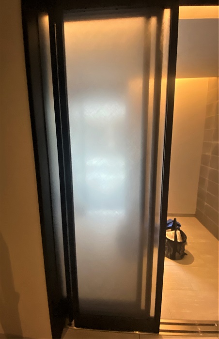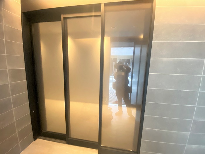 ‍マンションエントランスの自動扉カラスにデザインタイプの目隠しフィルムを貼付け。