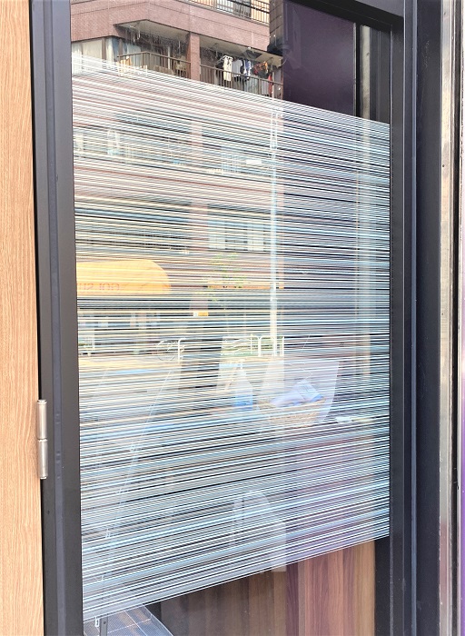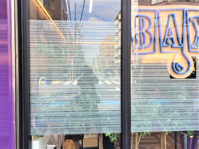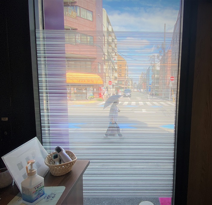 ‍店舗の窓にデザインタイプの目隠しフィルムを貼付け。