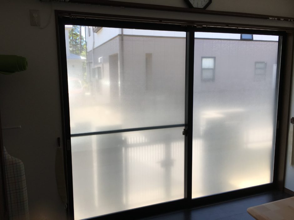 ‍施工後。下部が曇ったタイプを貼ることで、外の歩行者からの視線は隠しつつ、上部から太陽の光は入るので部屋が大幅に暗くなることはありません。