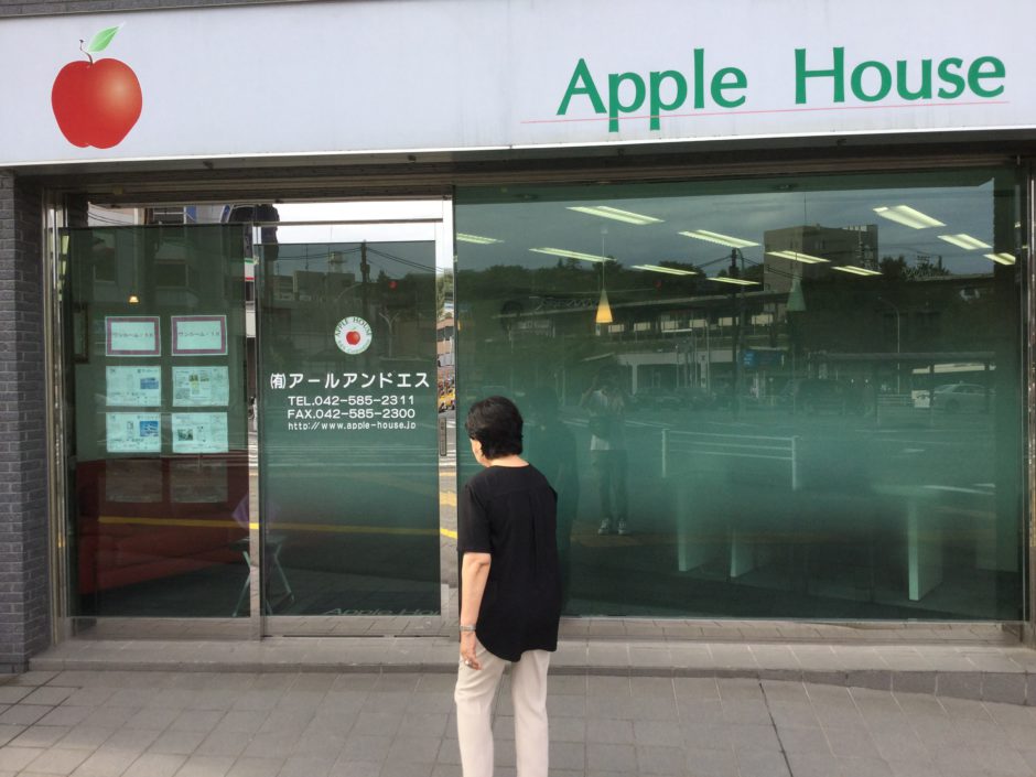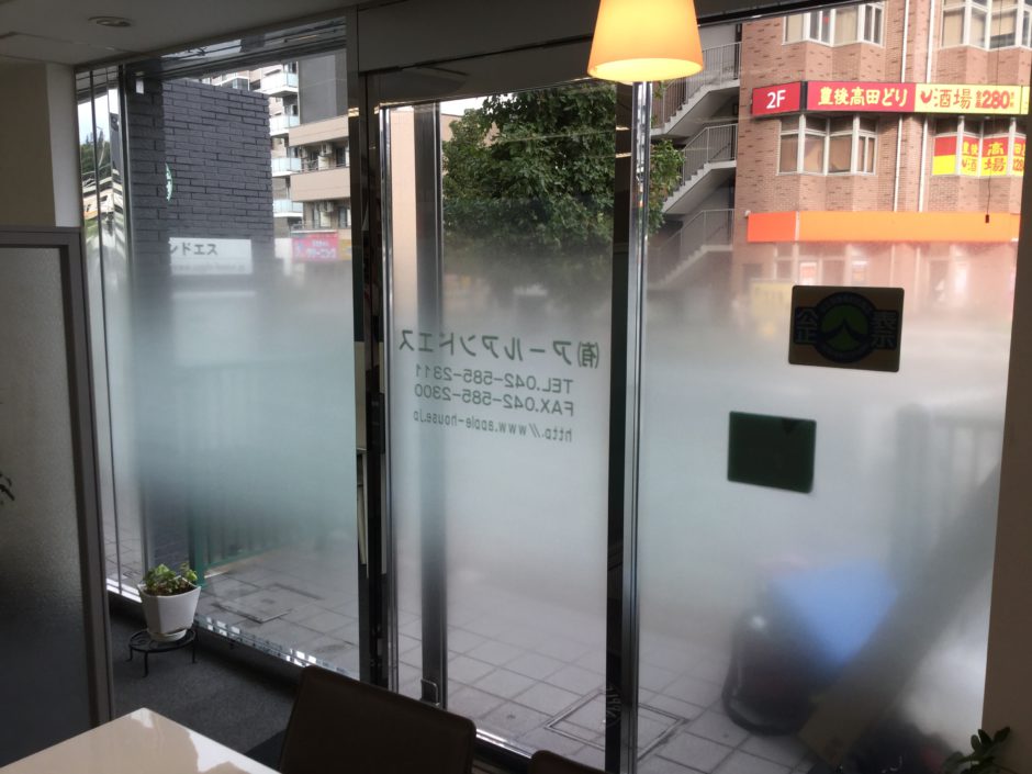 ‍施工後。外から来店したお客様の姿が丸見えにならないよう、中心部のみ曇っているタイプのフィルムを施工しました。